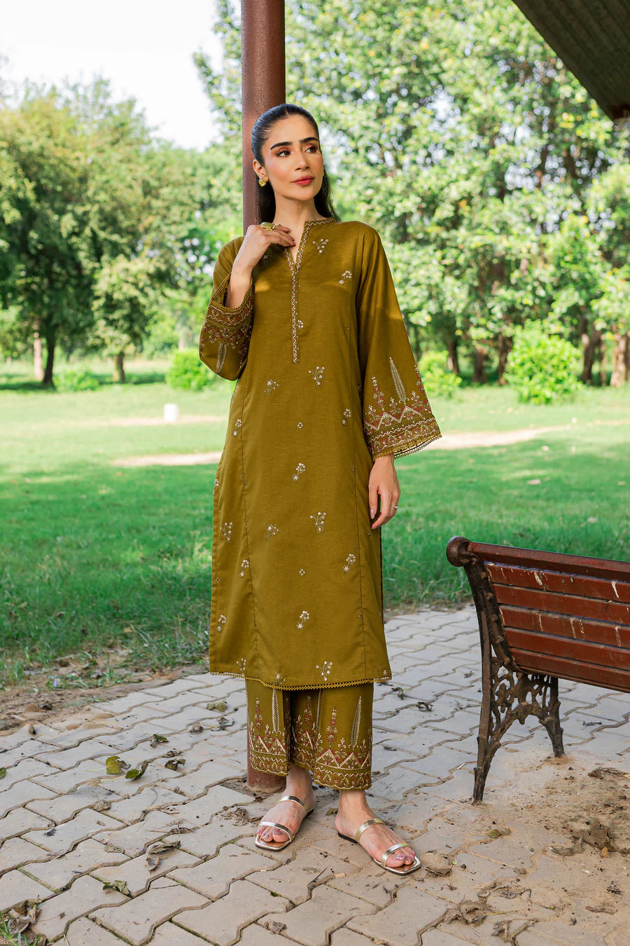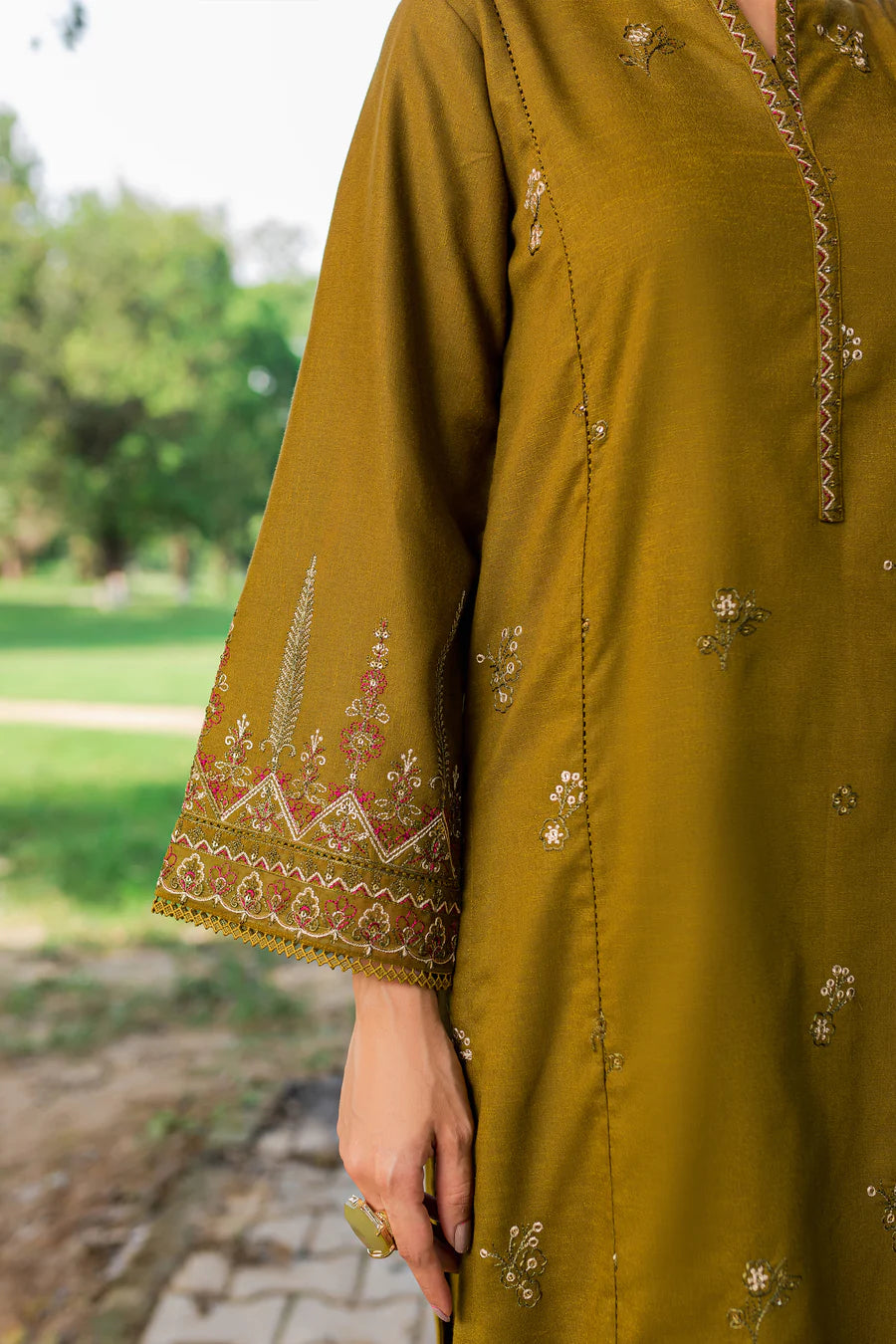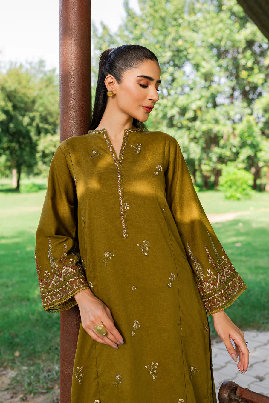 Elevate your wardrobe with our finest quality Fine Khaddar in the shades of mehndi green. Subtly designed paneled shirt displays a spread of embroidery on the front and a delicately embroidered patti placed along its ban neckline. Heavily embroidered sleeves incorporate sequin and crochet lace details.