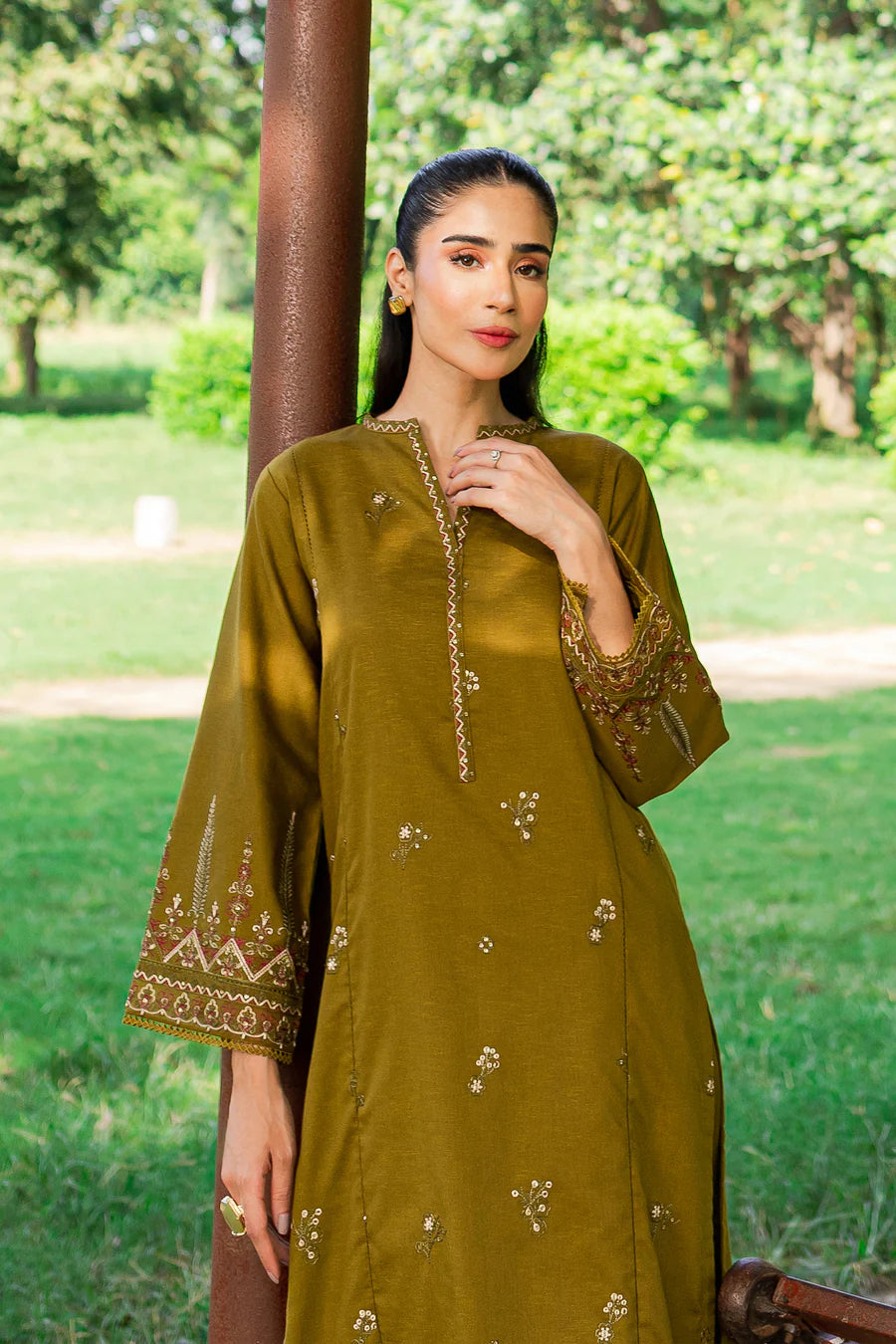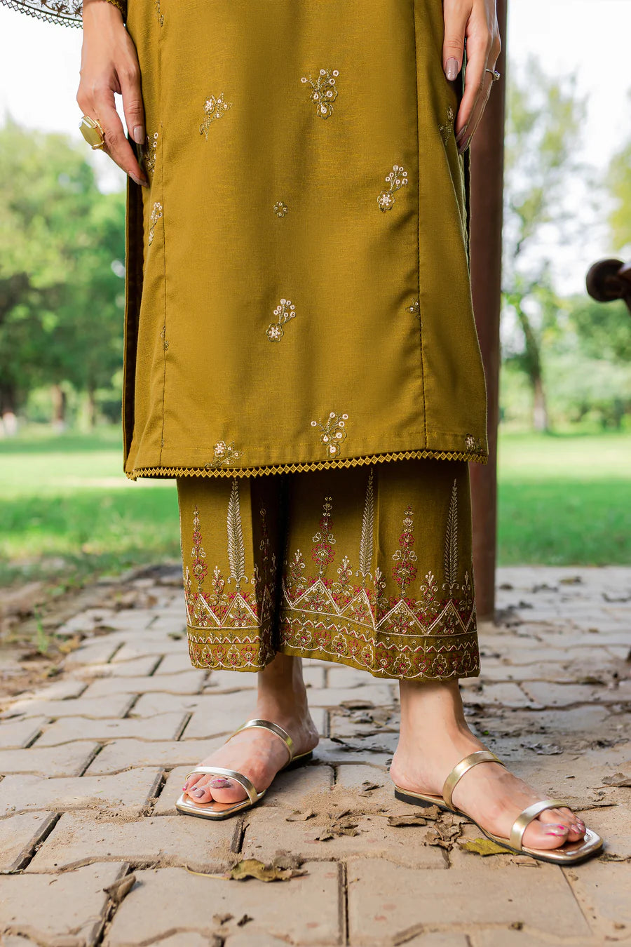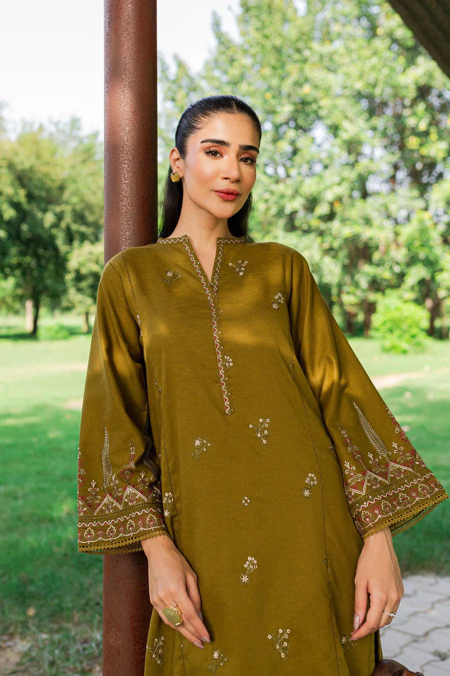 Elevate your wardrobe with our finest quality Fine Khaddar in the shades of mehndi green. Subtly designed paneled shirt displays a spread of embroidery on the front and a delicately embroidered patti placed along its ban neckline. Heavily embroidered sleeves incorporate sequin and crochet lace details.