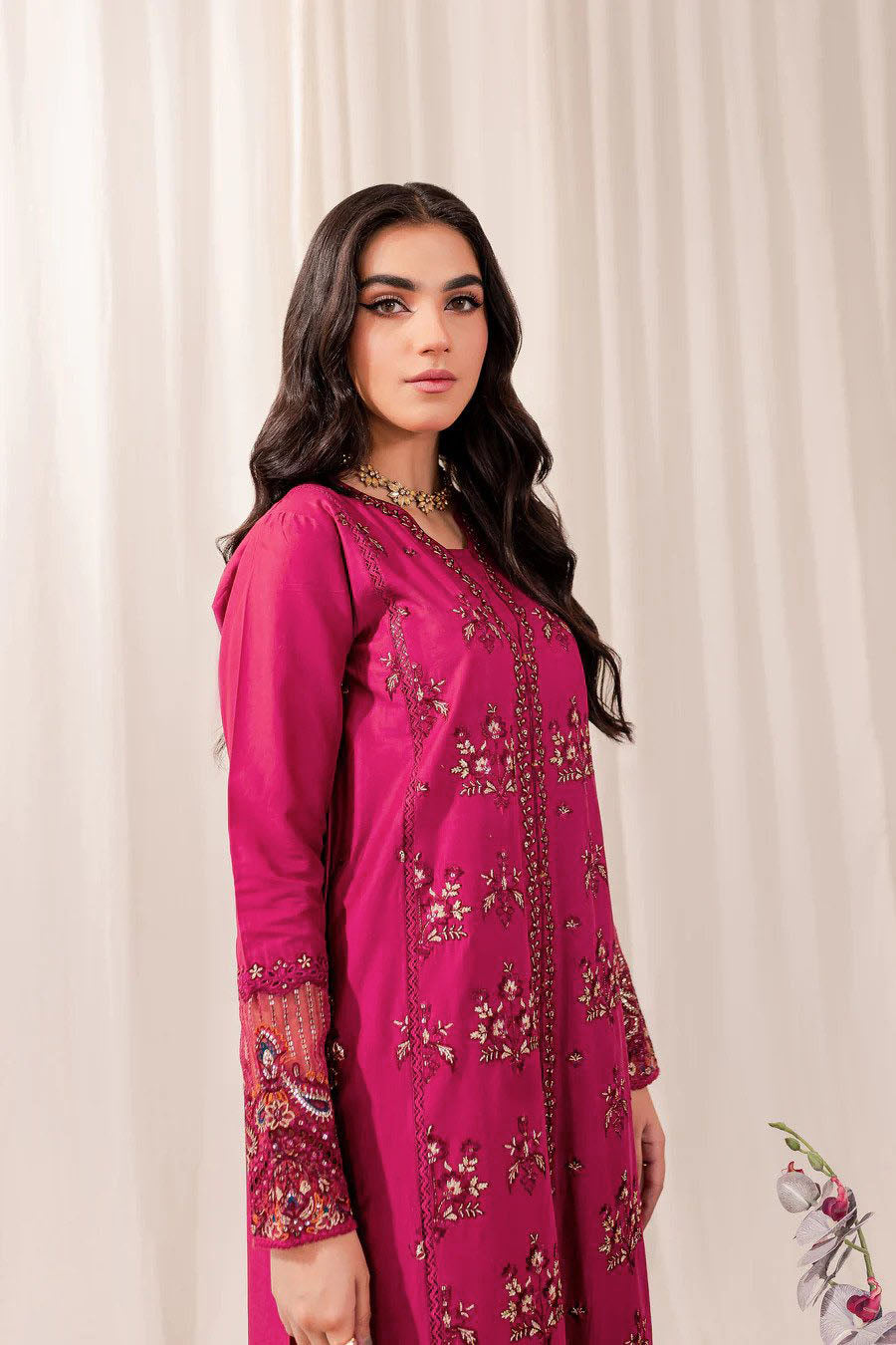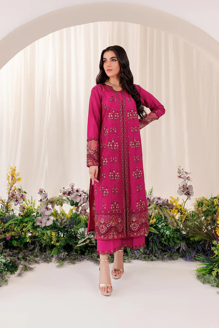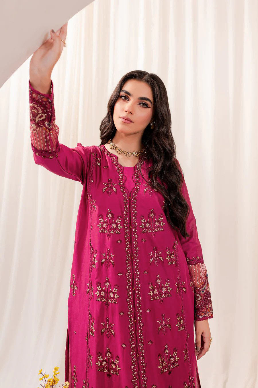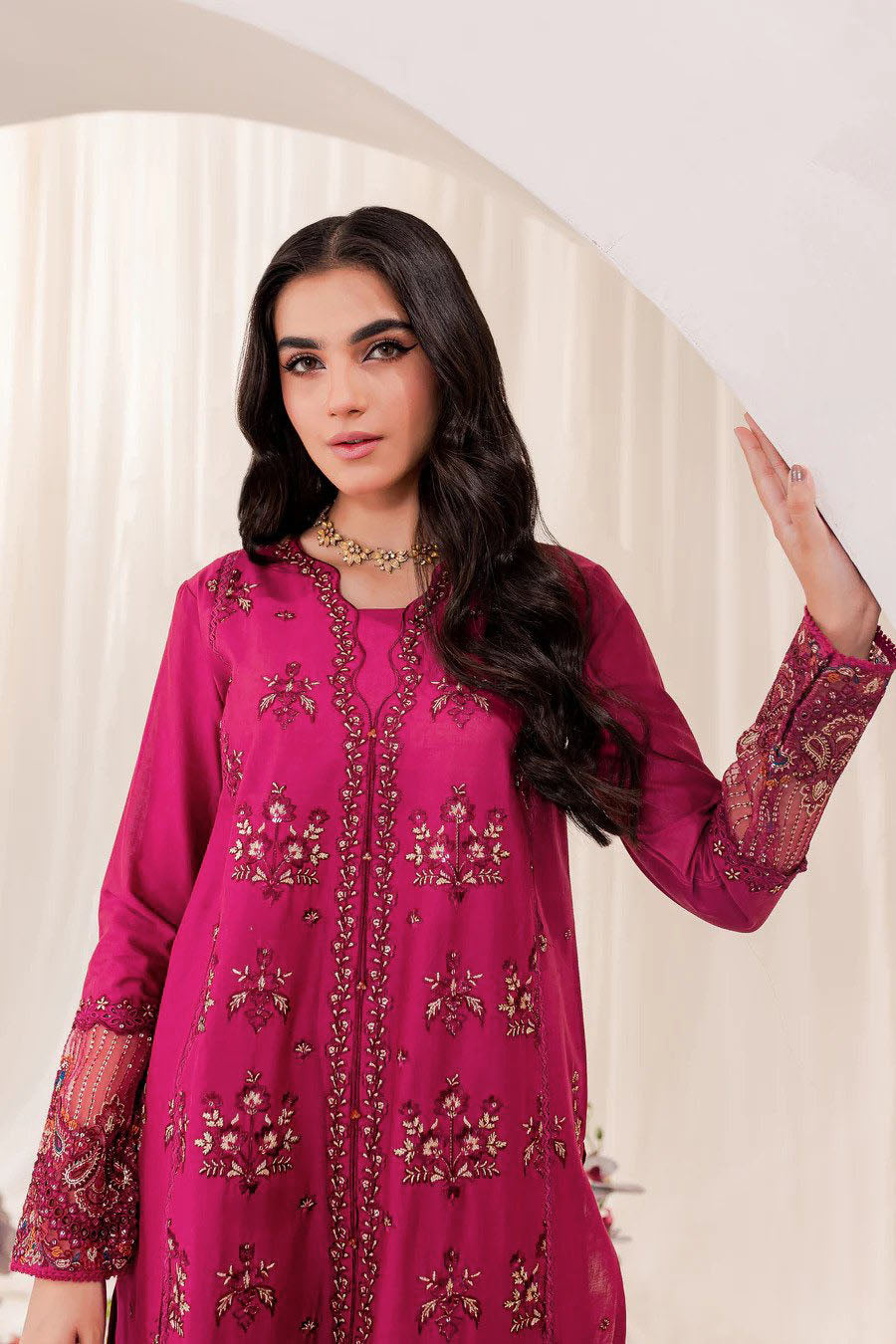 Strikingly designed front open paneled shirt cut from the finest quality Lenin Stuff in the shades of deep pink. Embellishments feature fully embroidered shirt donned with heavy embroidery spread in vibrant hues and organza patchwork detailing
