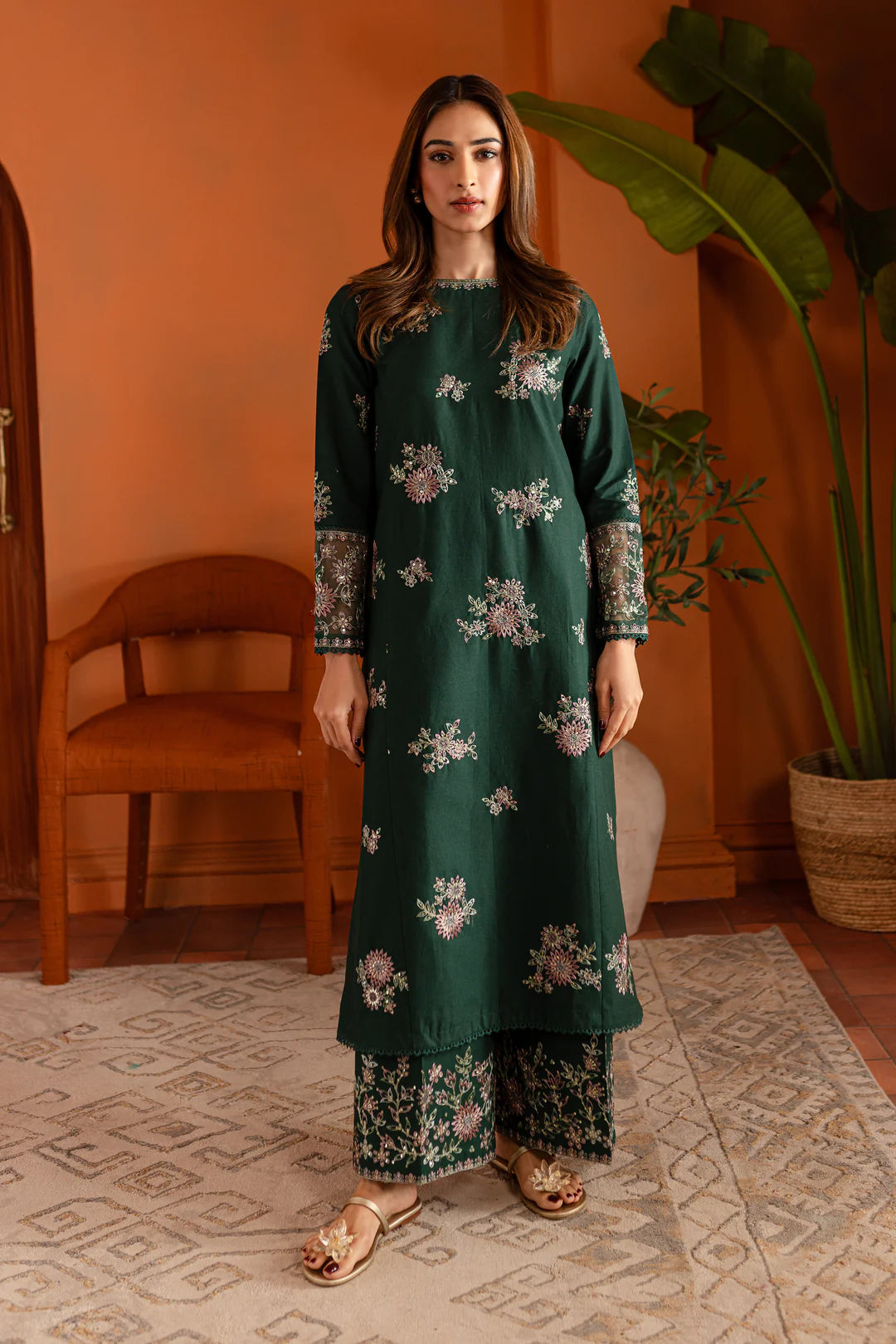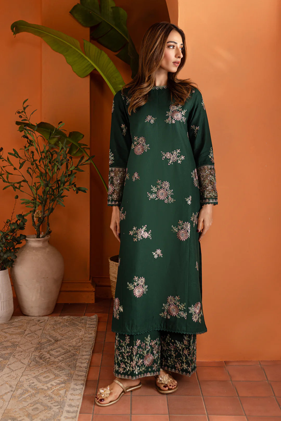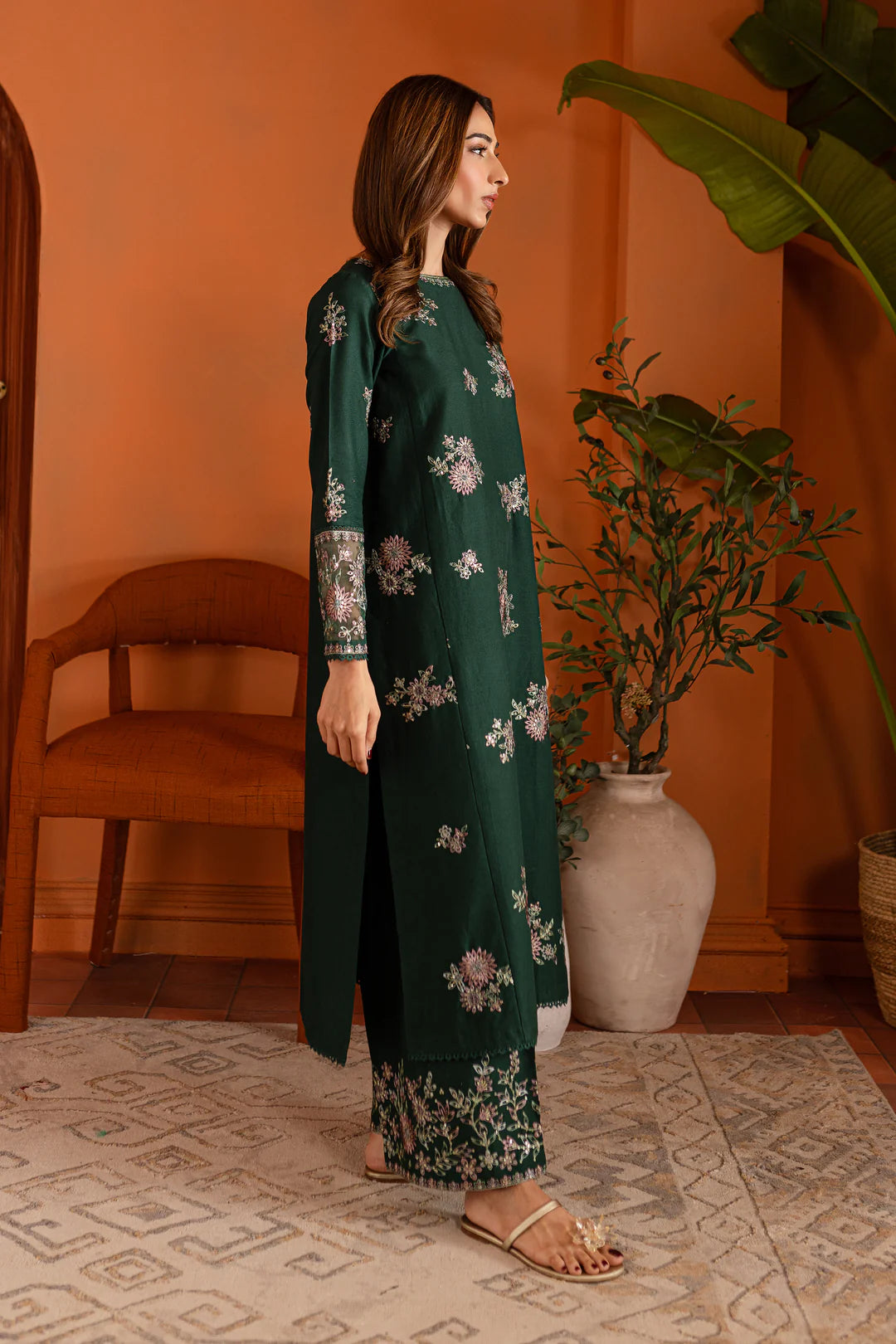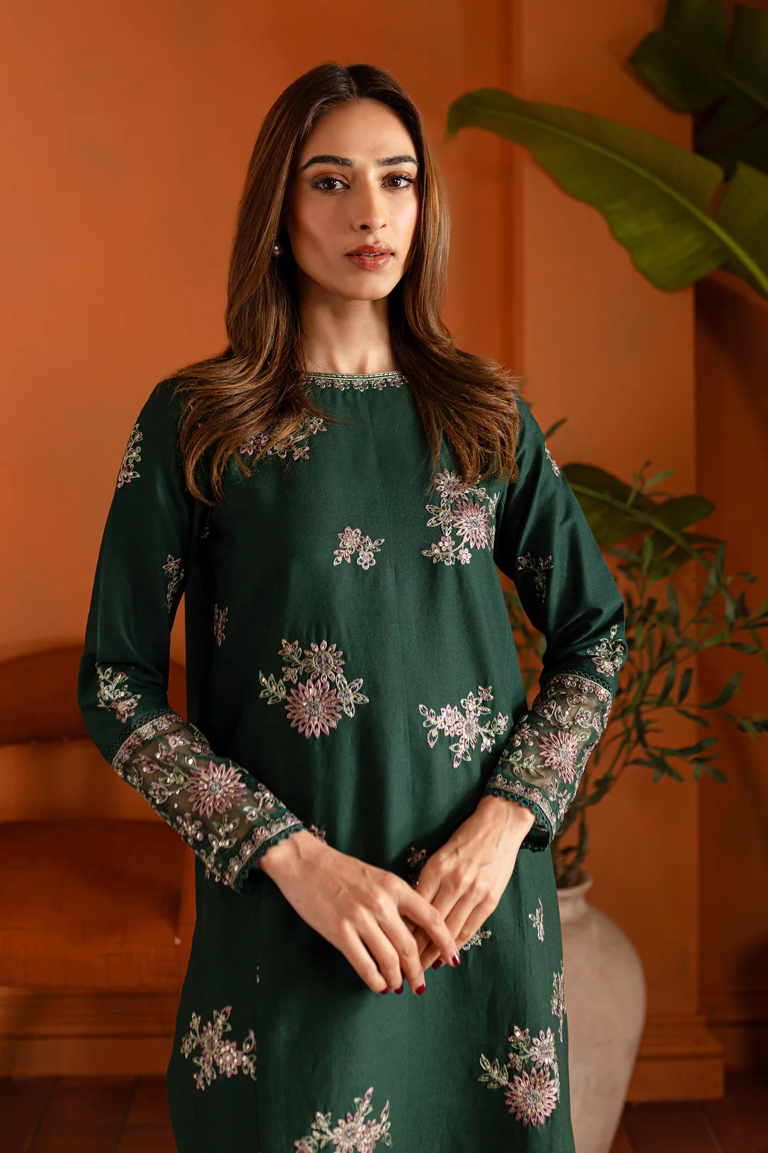 Elegance meets simplicity in this bottle-green Cotton ensemble, designed for effortless style. The shirt is a long silhouette with a crew neckline and an intricate floral buch spread, beautifully finished with lace. The fitted sleeves are adorned with organza borders and lace details, creating a polished and sophisticated look.