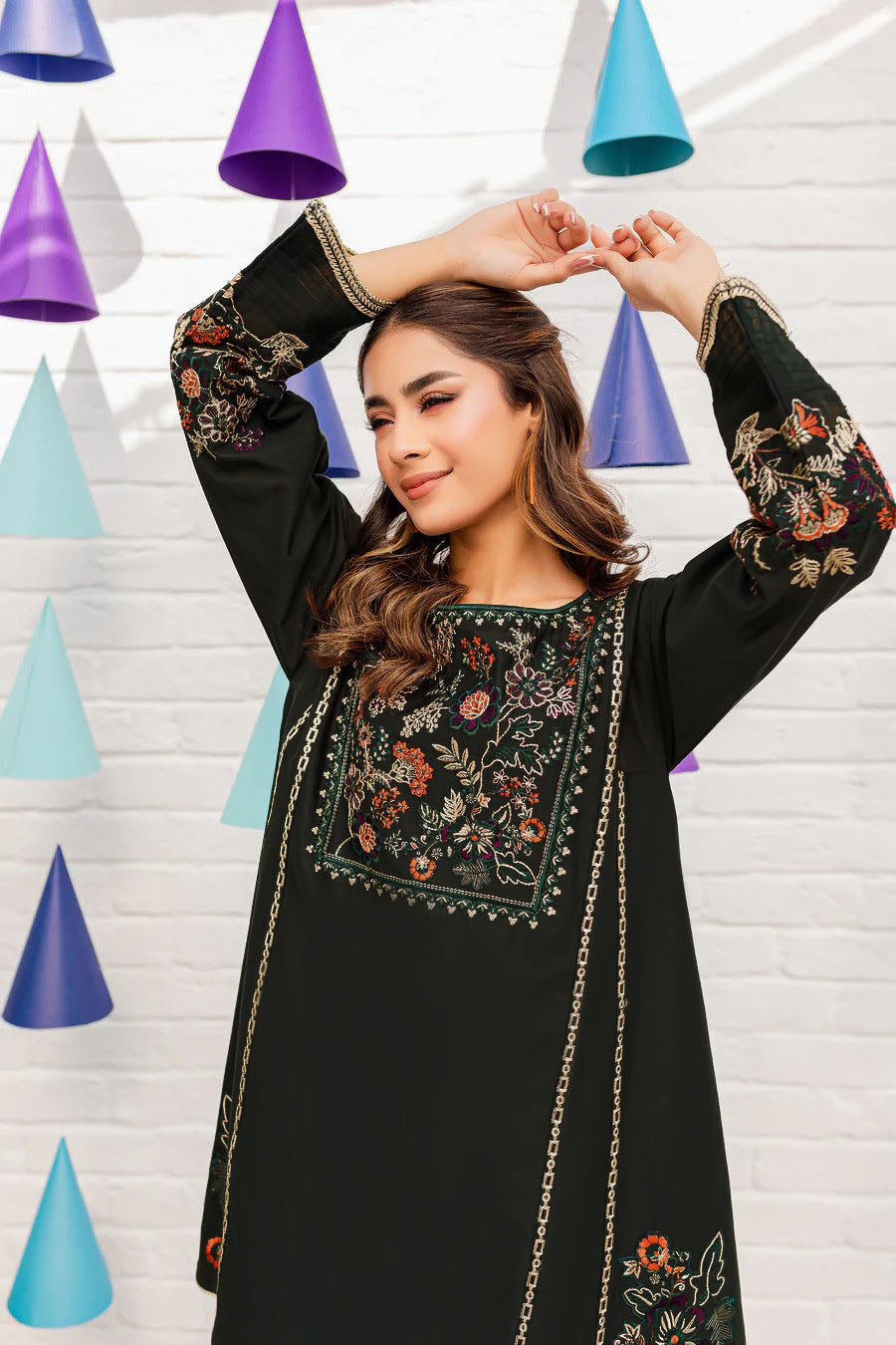 Beautifully designed short paneled frock cut from the finest quality Khaddar the shades of Black. Embellishments feature gorgeously embroidered front with glitzy details of organza pleated patch work and lace finishing