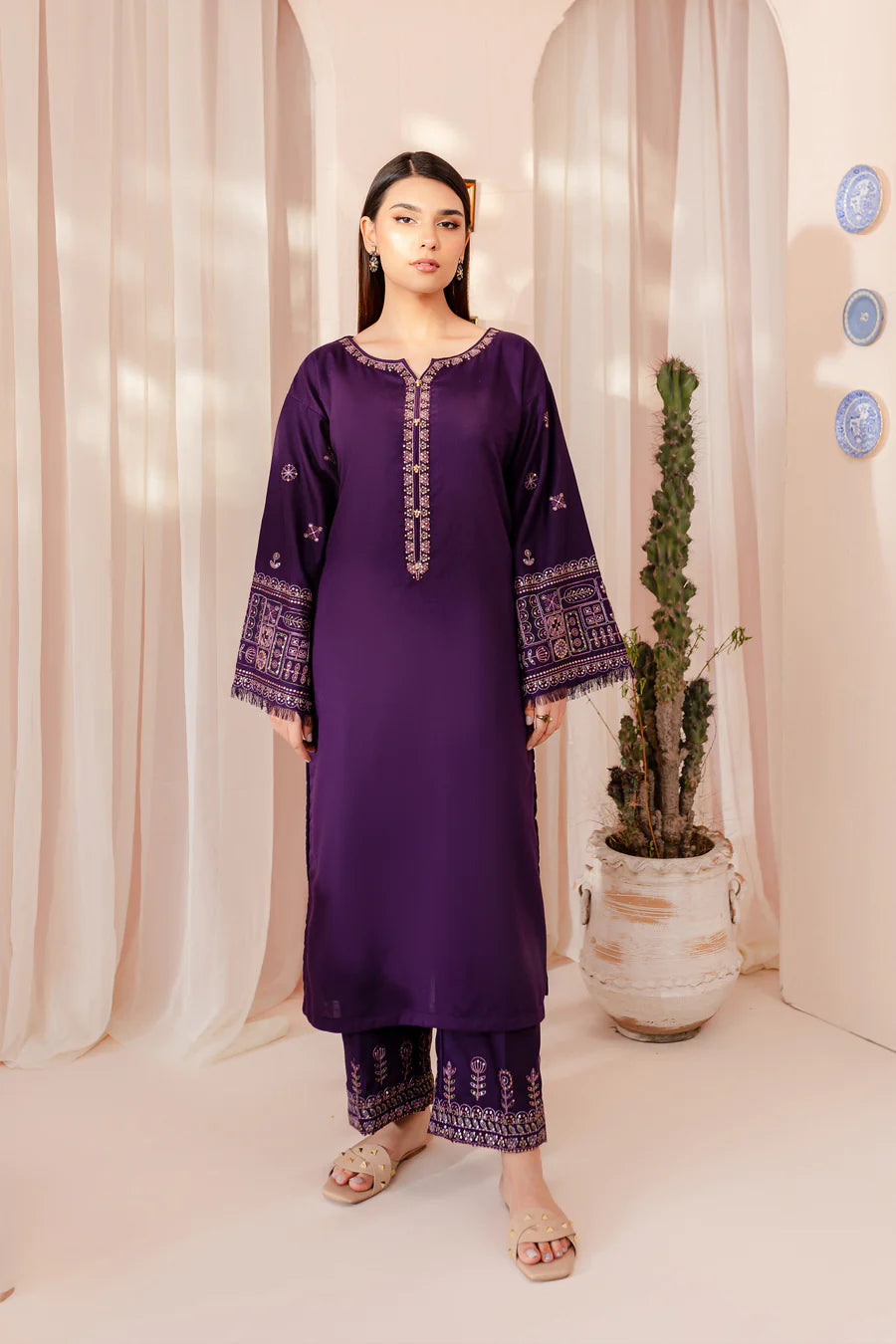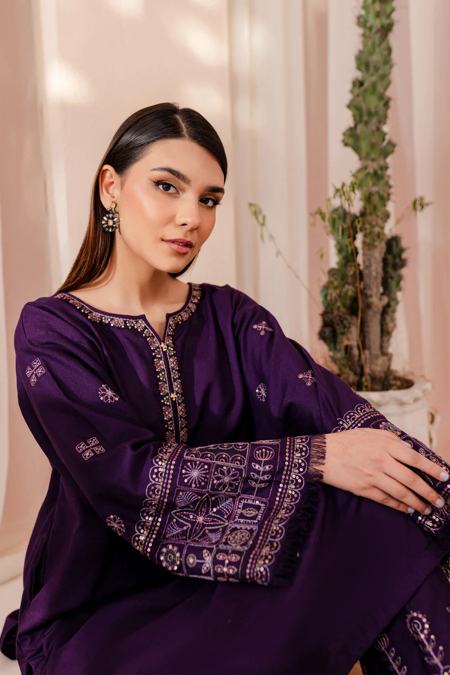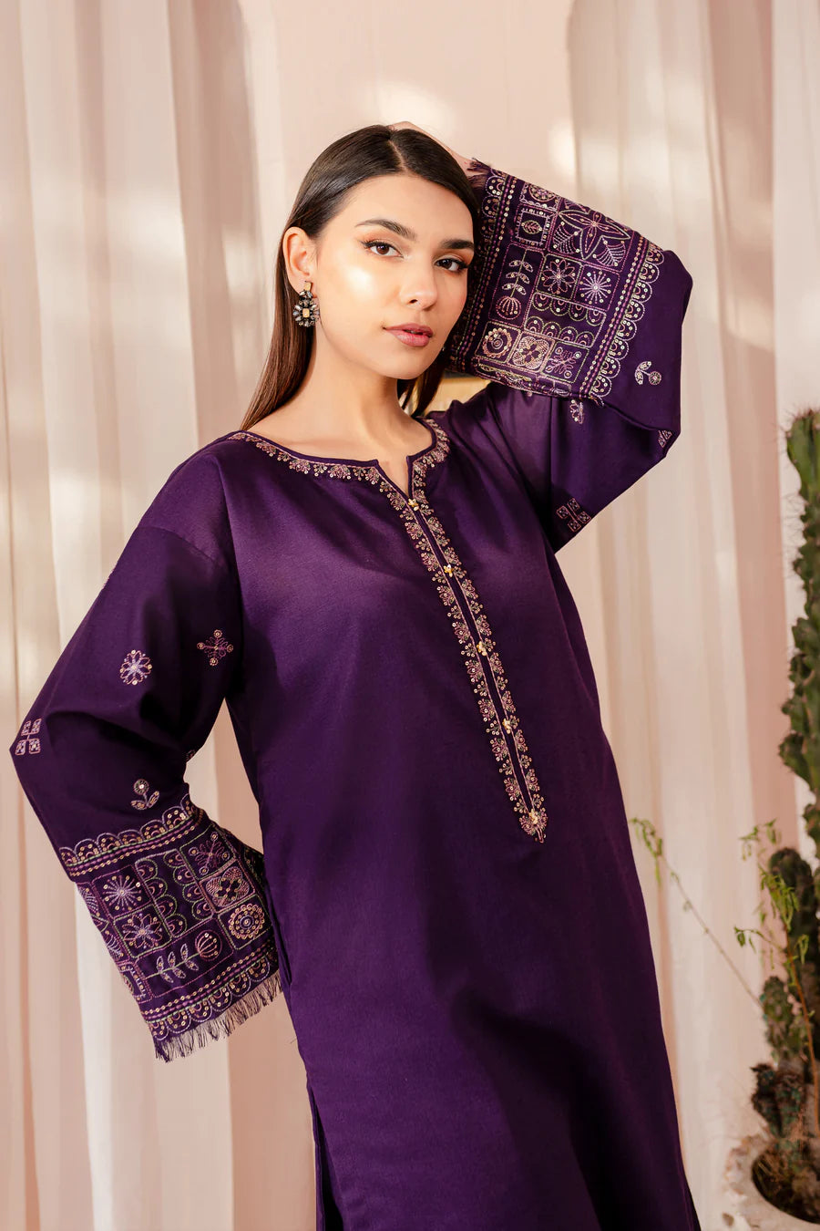 Indulge in luxury with this opulent piece made from premium quality COTTON in the shades of purple. Elegantly crafted shirt displays embroidery along the neckline embellished with material collages. Adornments further include detailed embroidery at sleeves featuring fringe detail at hem.