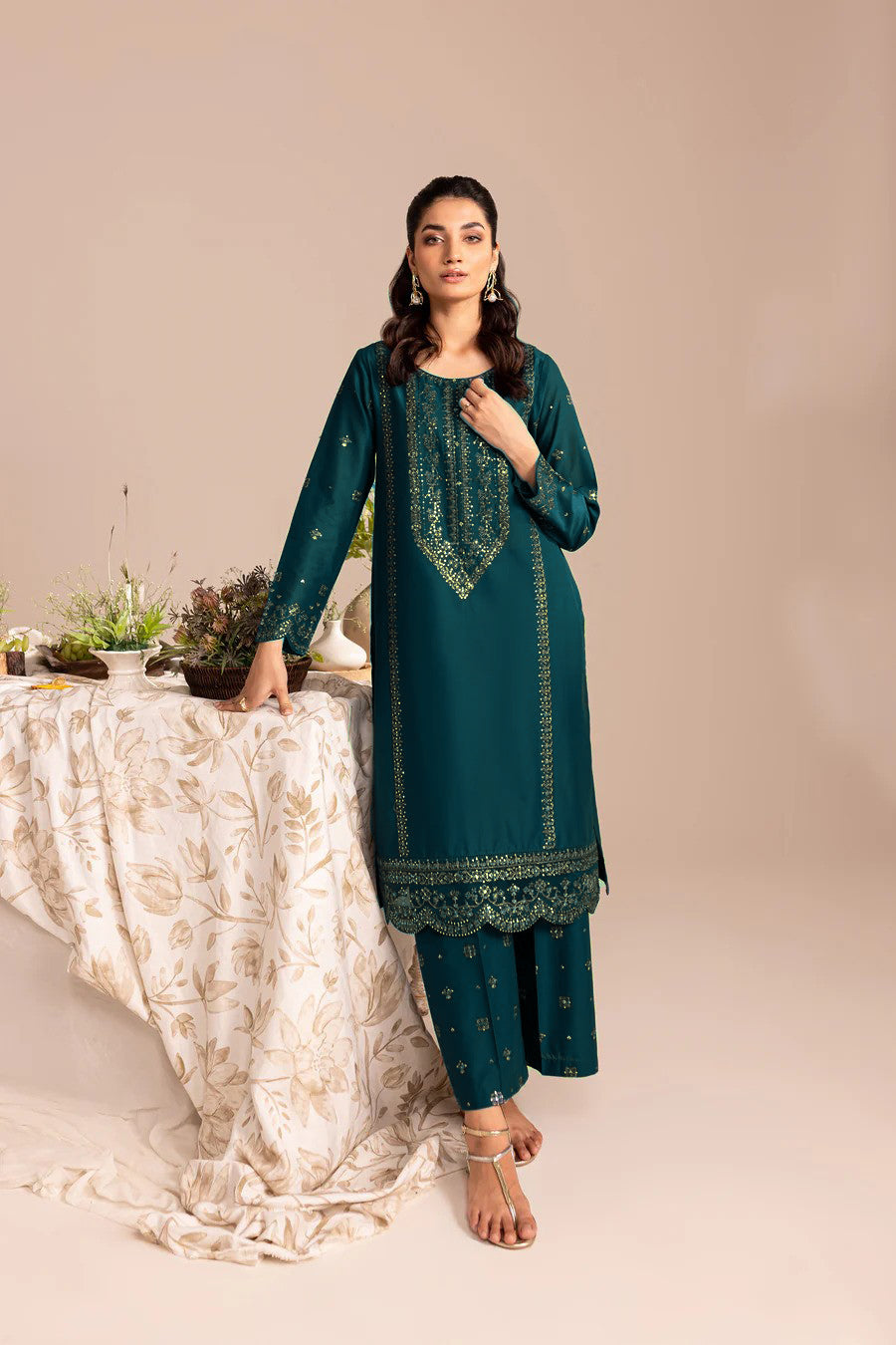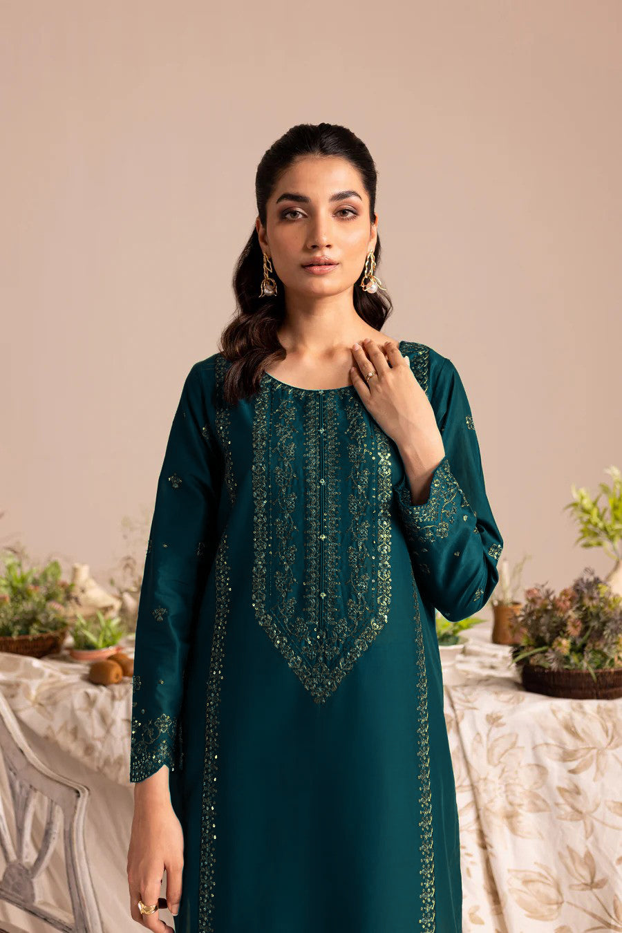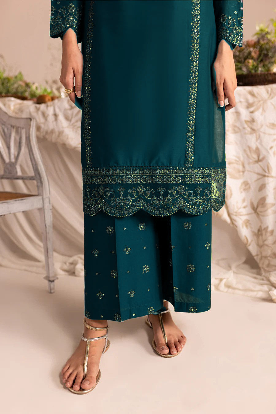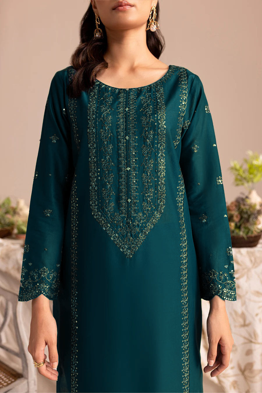 Add a touch of glamour to your look with our finest quality Ayrish in the shades of Zinc. Beautifully designed paneled shirt features a heavily embroidered neckline with collage finishing. Adornments include intricate embroidery along the panels and organza border at hem finished with scalloping. Noteworthy details include embroidered sleeves scalloped at hem.