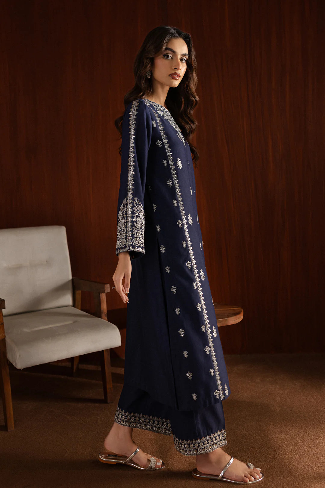 The blueberry blue Cotton shirt is designed with embroidered panels and a composed spread across the front. Its sleeves are heavily embroidered with detailed borders, creating an elegant and cohesive look.