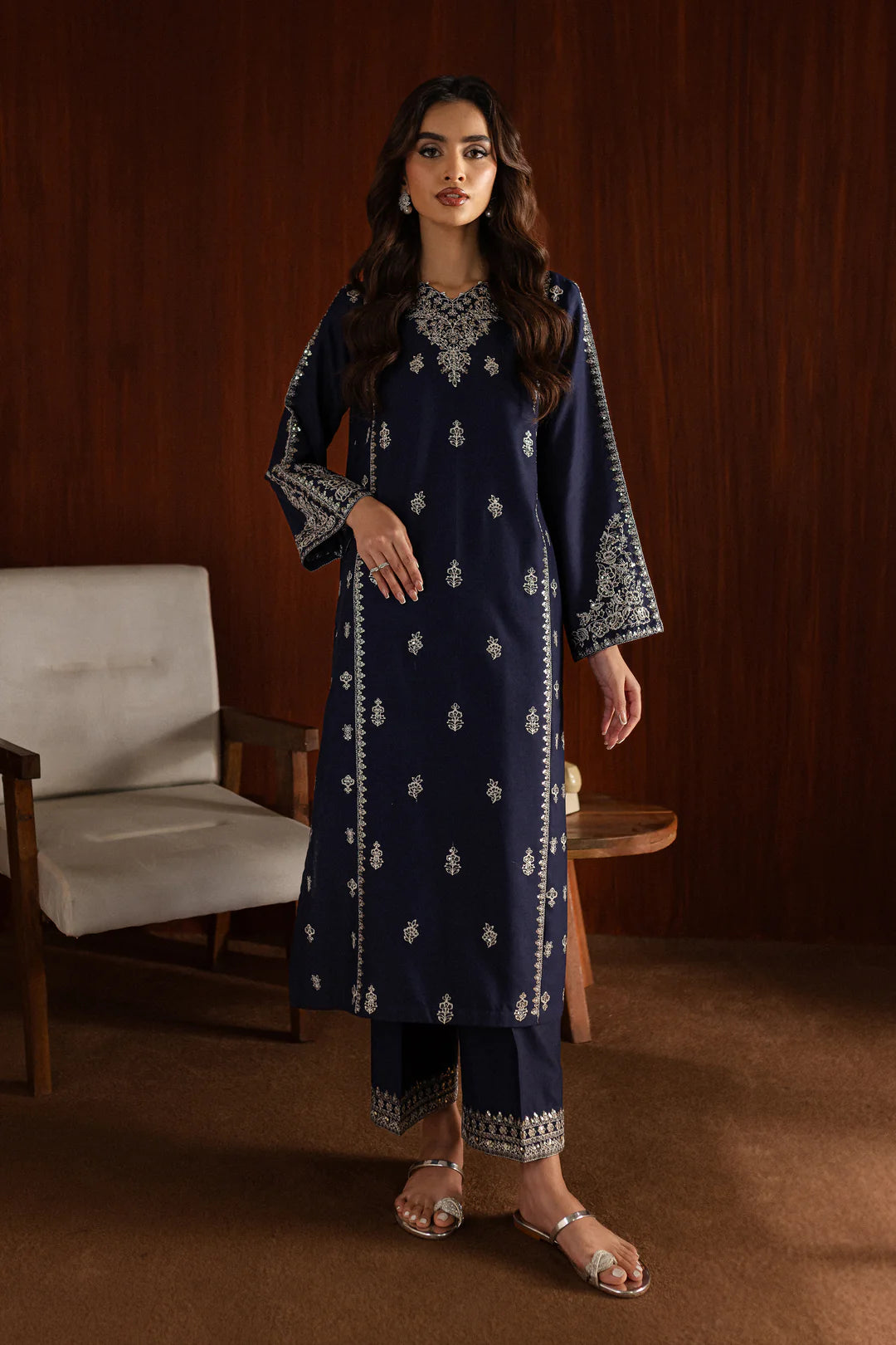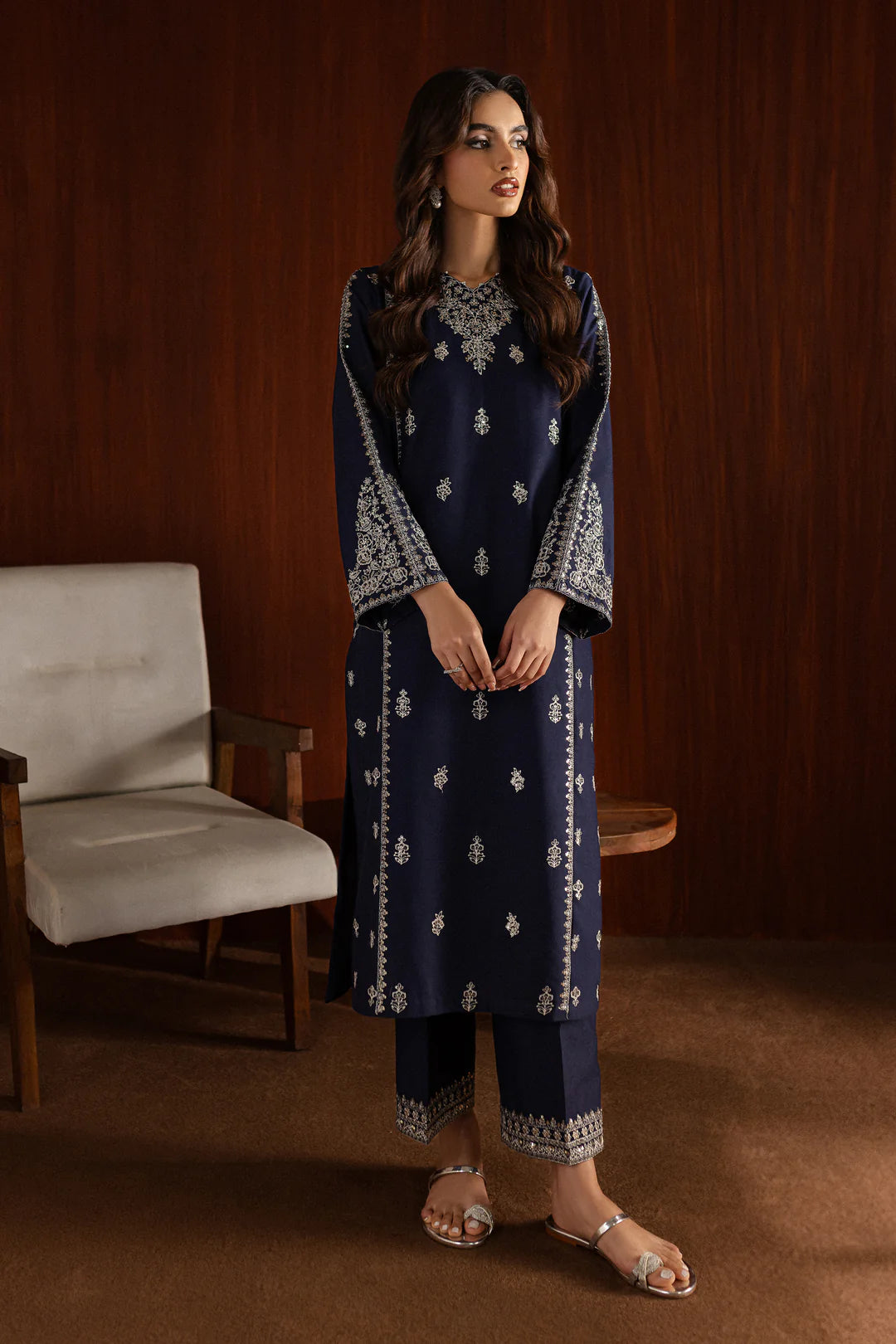The trousers, also made from Cotton, feature embroidery at the hem, complementing the intricate details of the shirt.