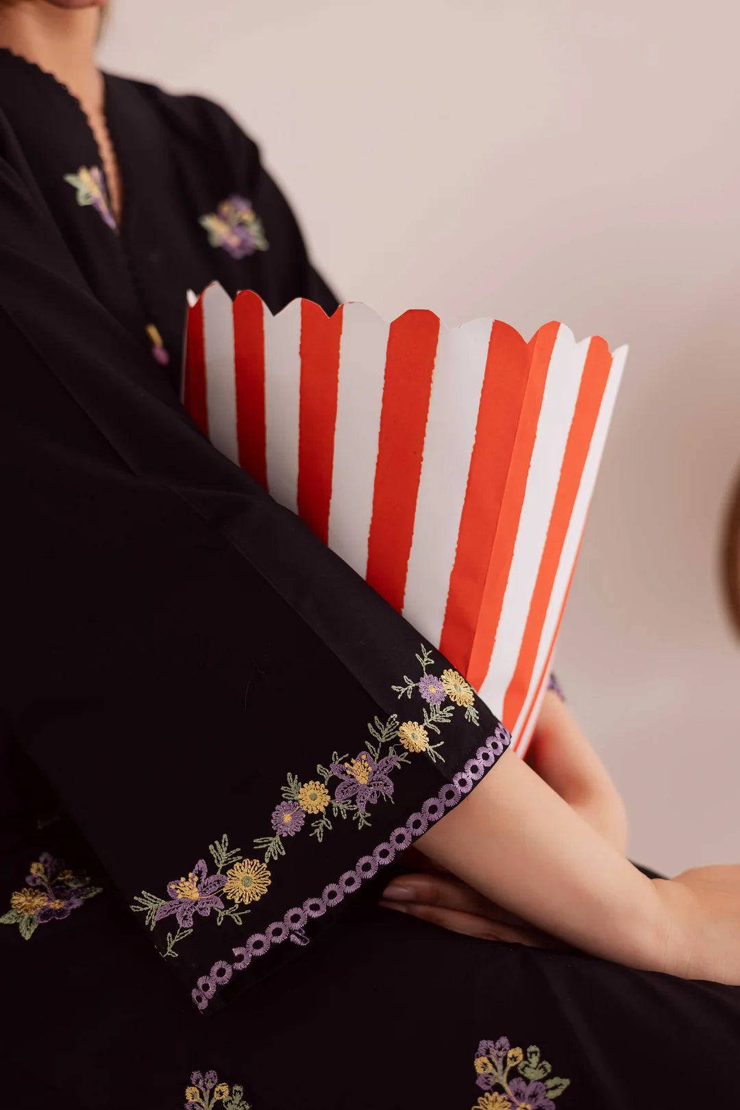 This COTTON exudes timeless elegance with a modern twist. The shirt is adorned with soft lilac and baby yellow floral embroidery, creating a striking contrast against the deep black base. A statement neckline and intricately embroidered sleeve hems add a refined touch, elevating the minimalist silhouette.