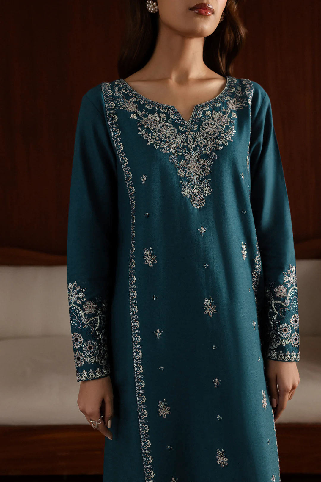 The Crinkle dupatta is intricately embroidered, offering a lightweight yet luxurious addition that complements the heavier textures of the shirt.
