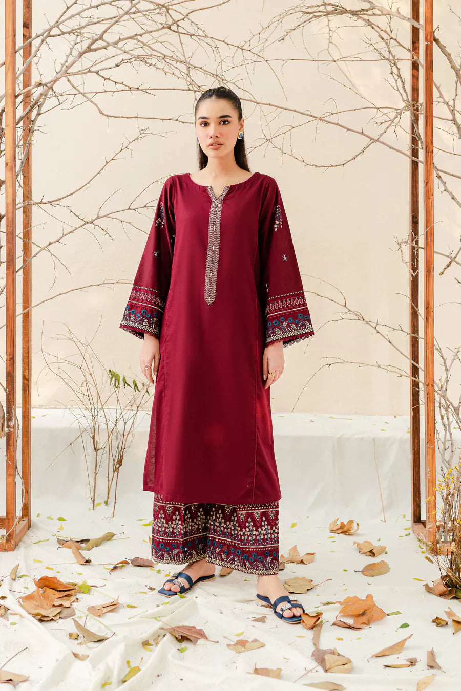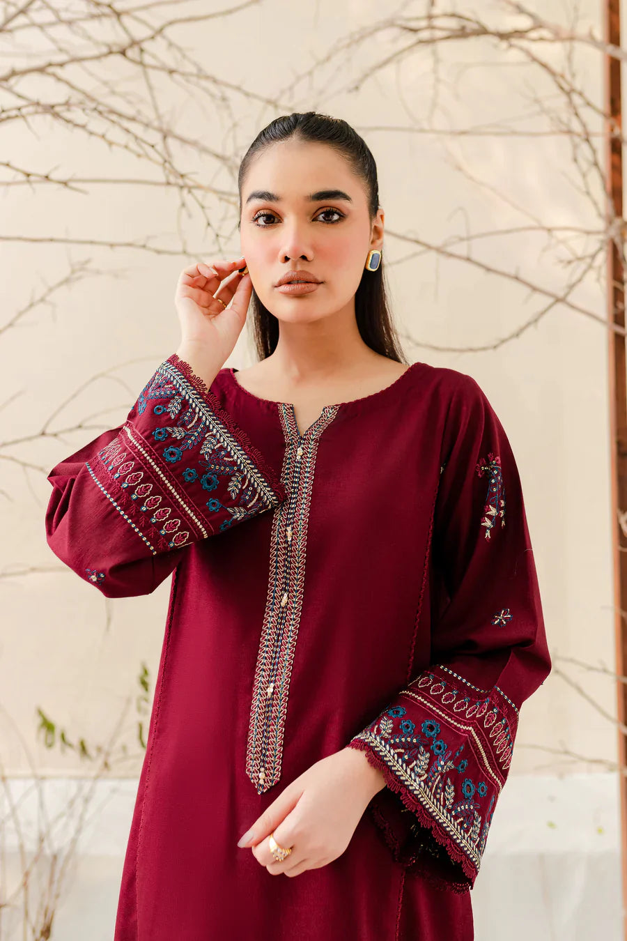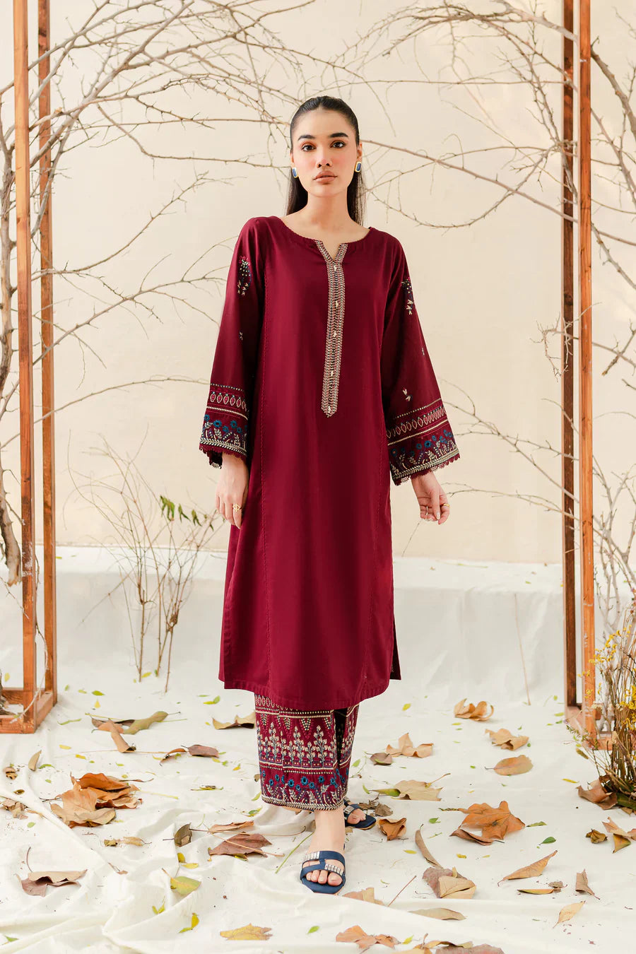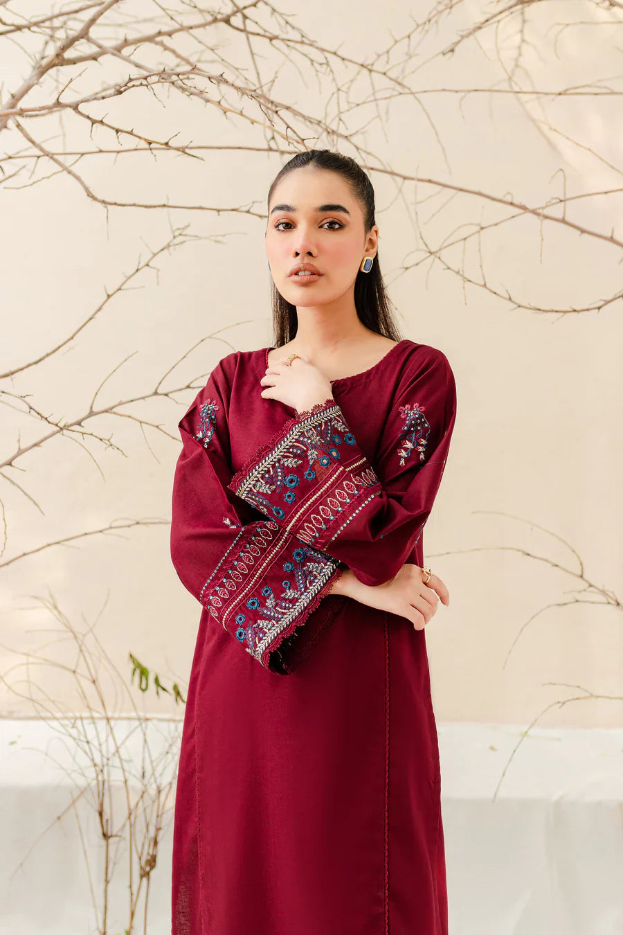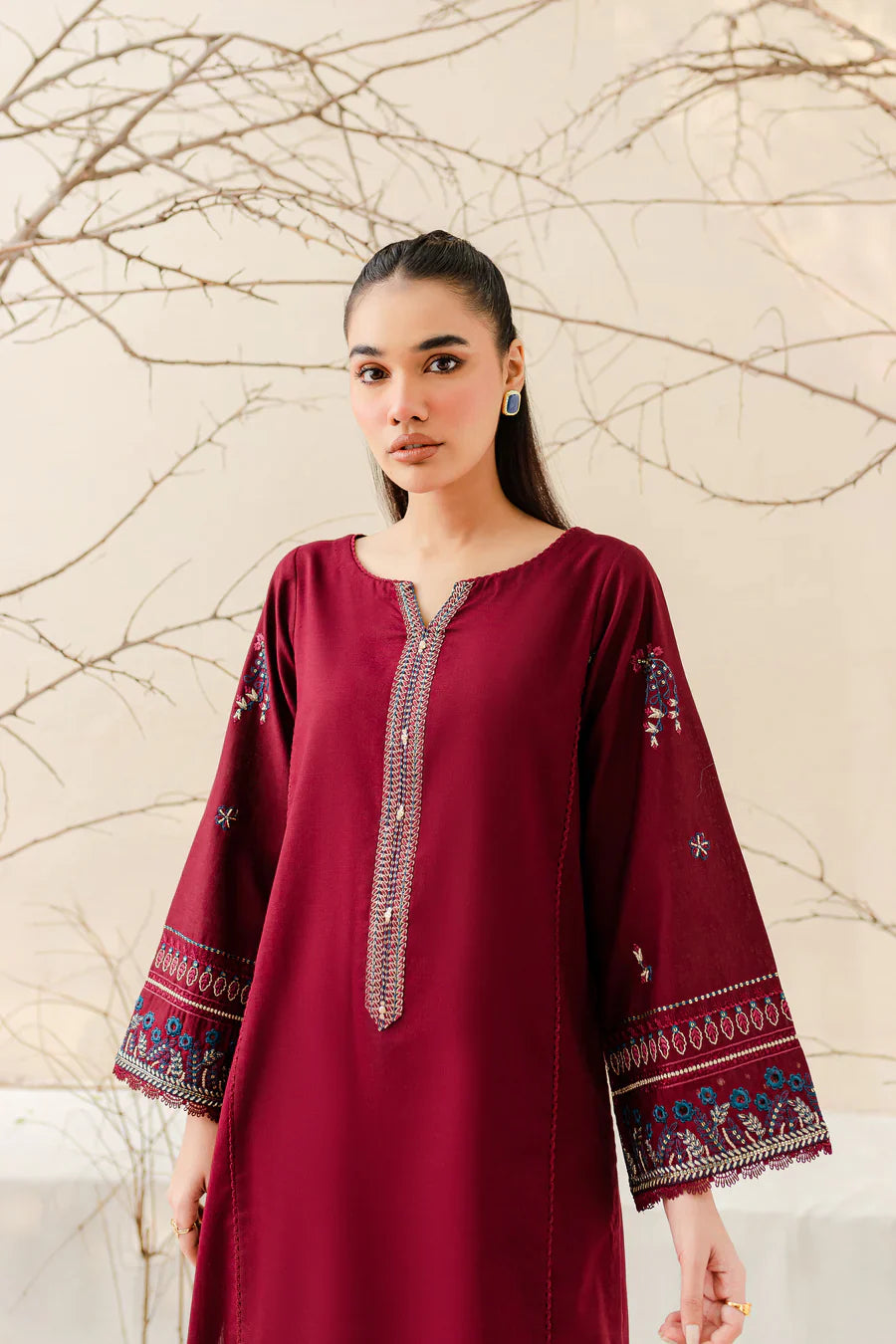 Indulge in luxury with this opulent piece made from premium quality lenin in the shades of maroon. Elegantly crafted shirt displays embroidery along the neckline embellished with hand work collage. Adornments further include detailed embroidery at sleeves featuring schiffli technique, fine sequin details, and lace finishing.