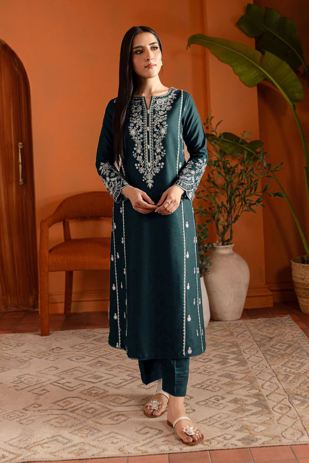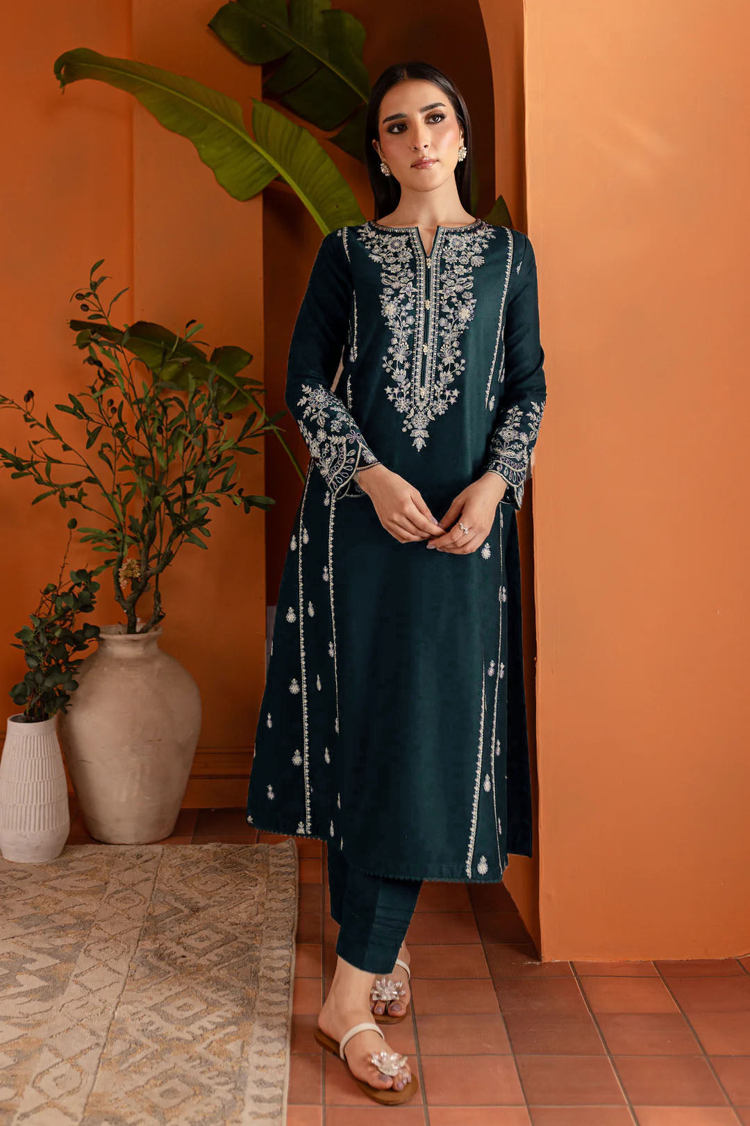The trousers are lace-finished, designed to harmonize beautifully with the intricate details on the shirt, offering a sophisticated yet comfortable winter look.
