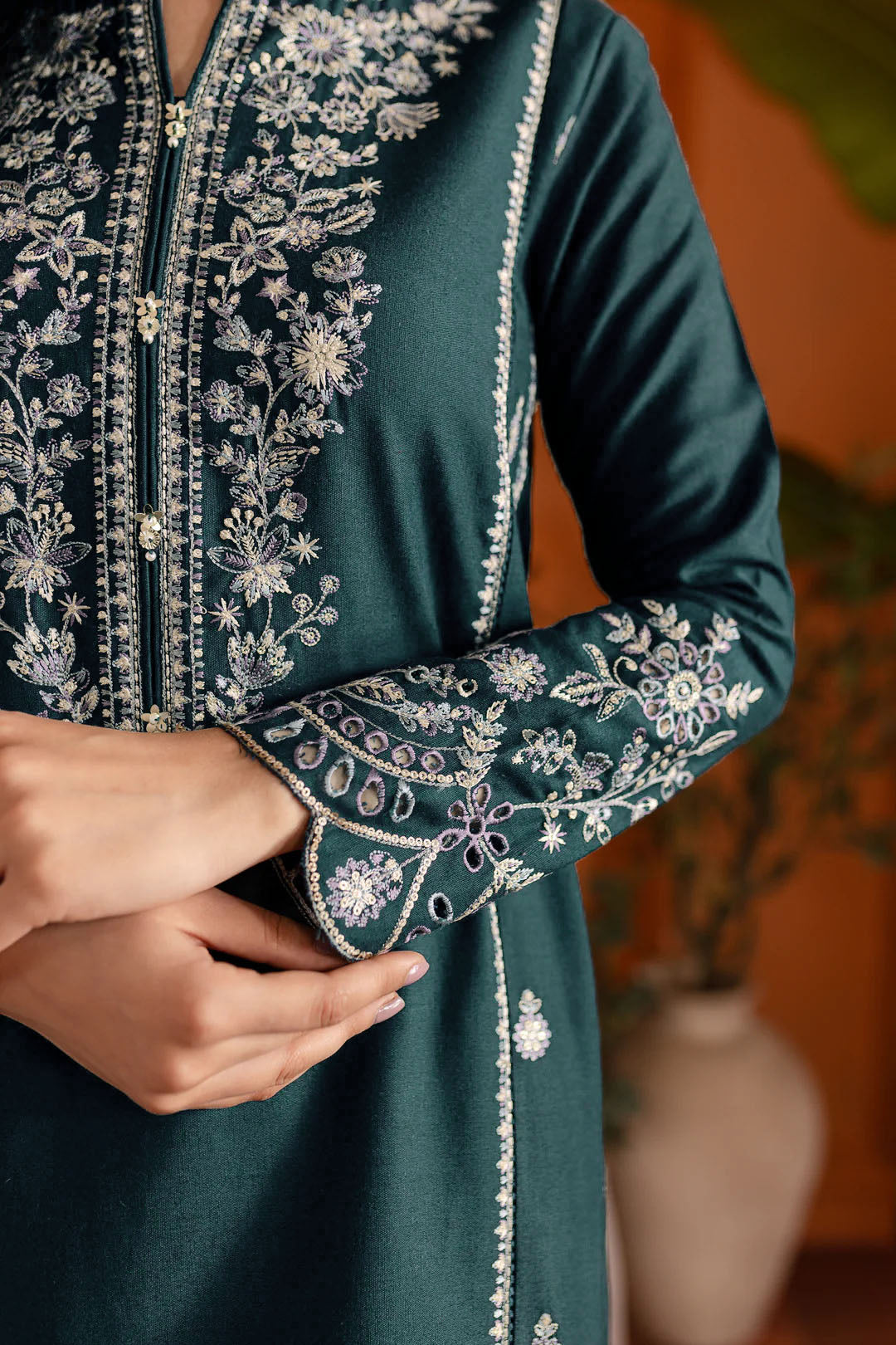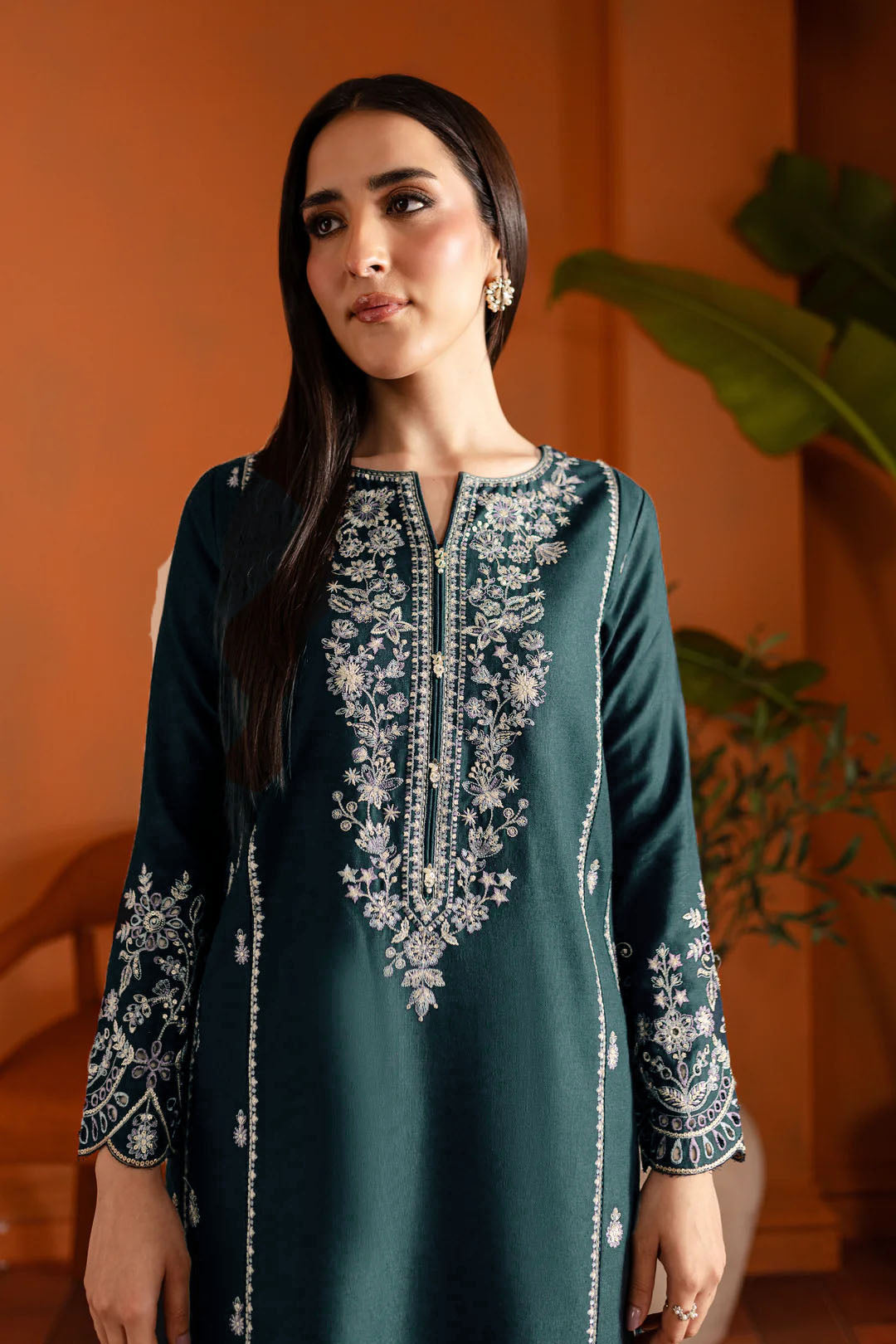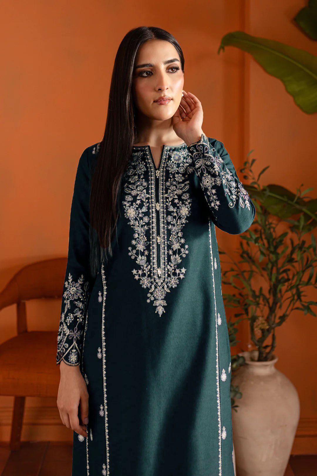 Refined and graceful, this blueberry-blue ensemble redefines COTTON The shirt features a long, five-panelled design with a composed embroidered neckline on the center panel, while the side panels are embellished with a motif spread. The fitted sleeves are adorned with scalloped embroidered borders and bowing details, adding a touch of elegance.