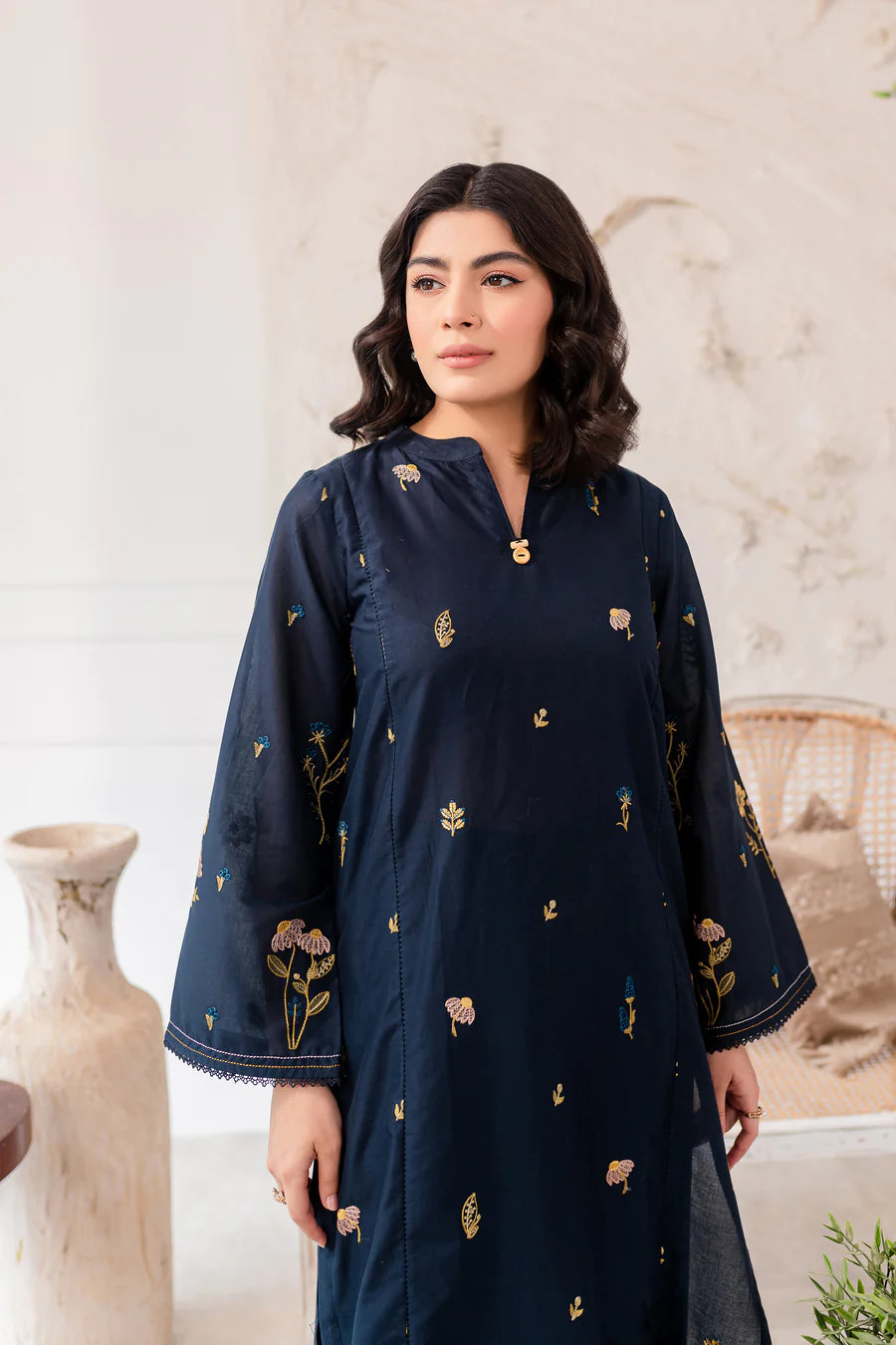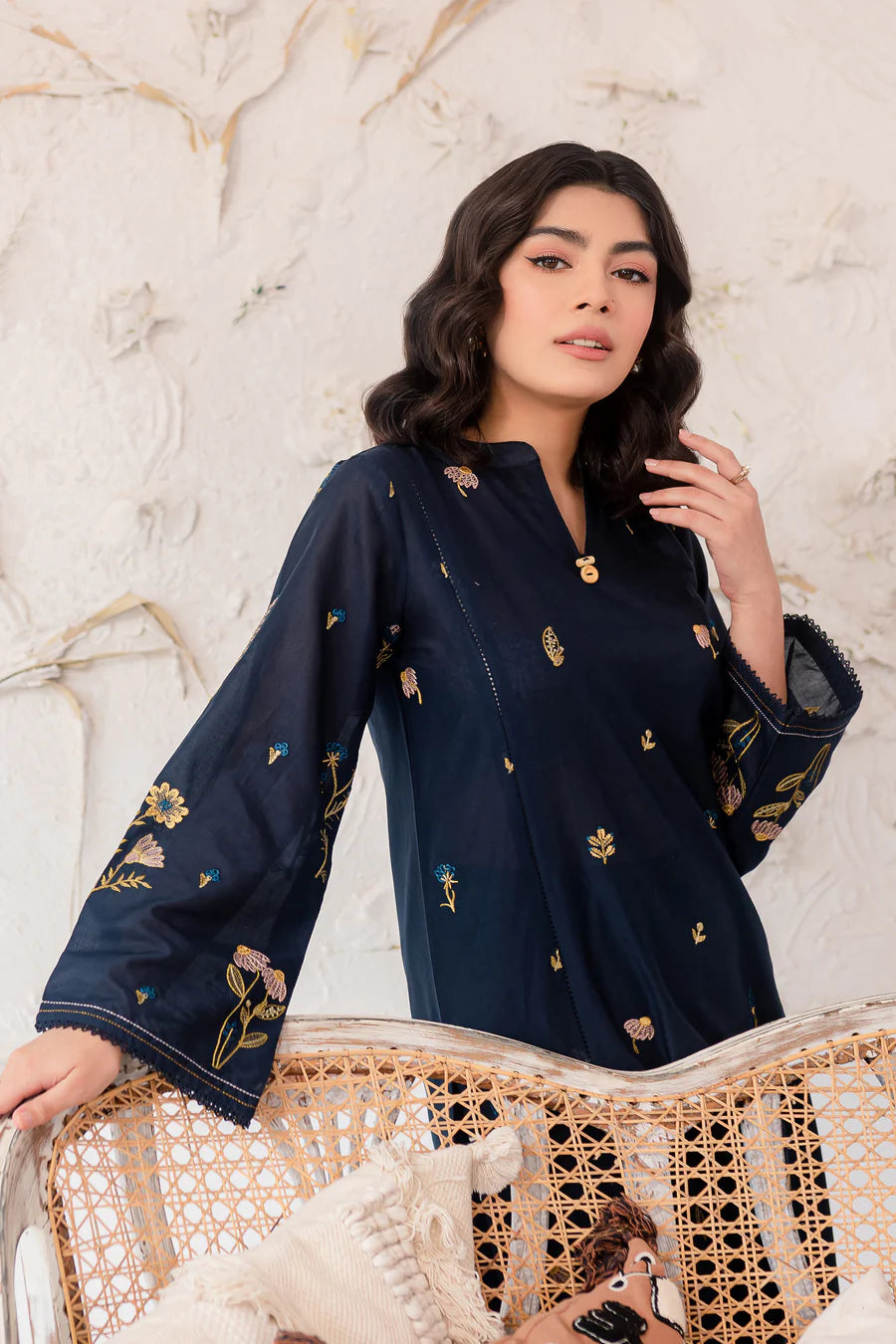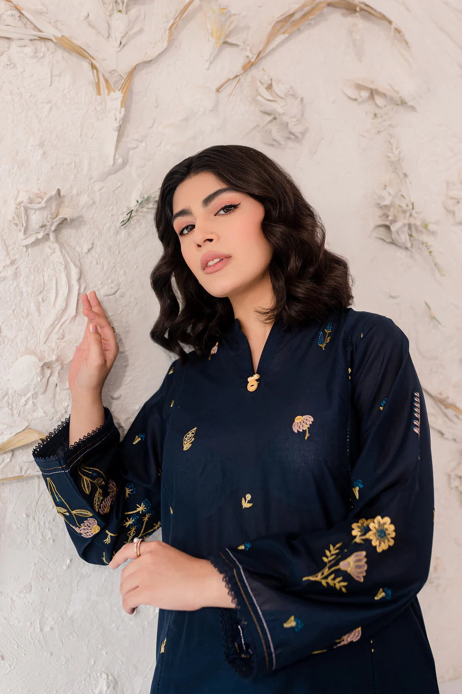 Elegantly crafted paneled straight shirt cut from our luxurious COTTON in the shades of midnight blue. Embellishments feature heavily embroidered straight shirt adorned with beautiful wooden buttons at neckline and lace finishing at sleeve hem.