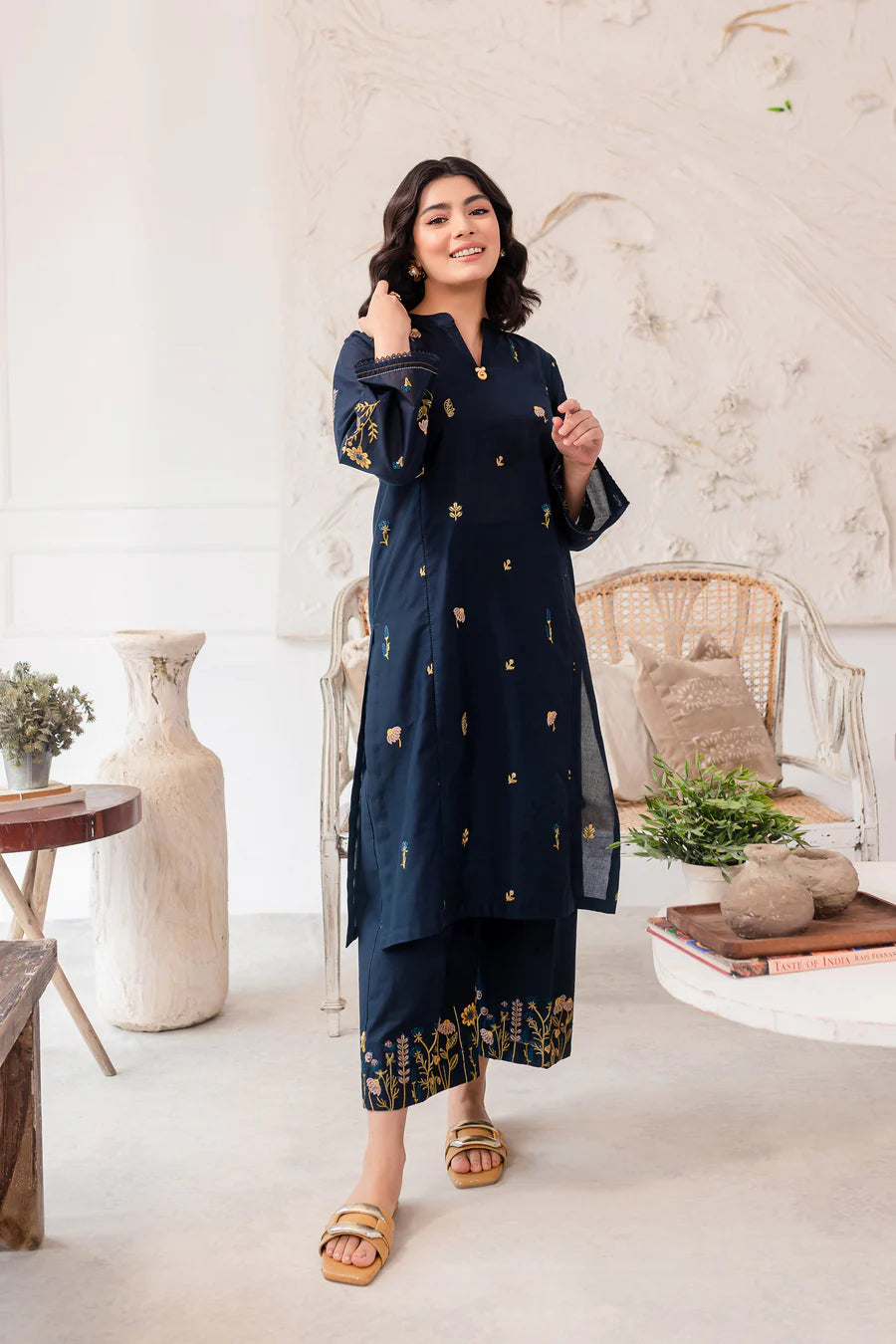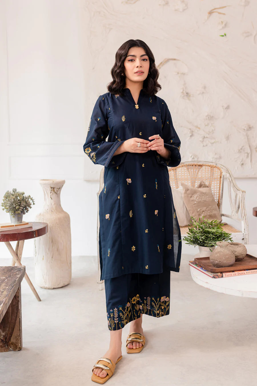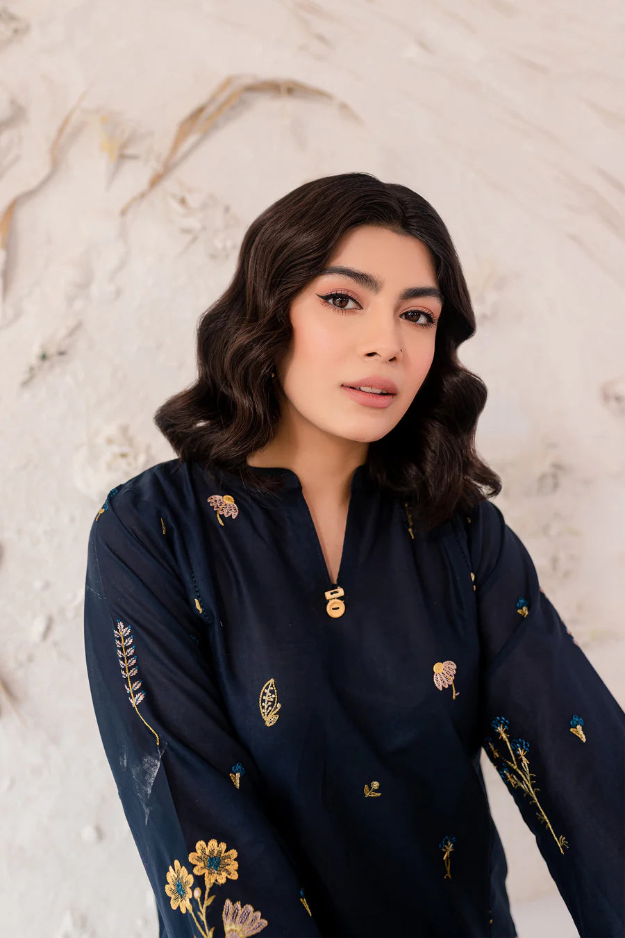 Elegantly crafted paneled straight shirt cut from our luxurious COTTON in the shades of midnight blue. Embellishments feature heavily embroidered straight shirt adorned with beautiful wooden buttons at neckline and lace finishing at sleeve hem.
