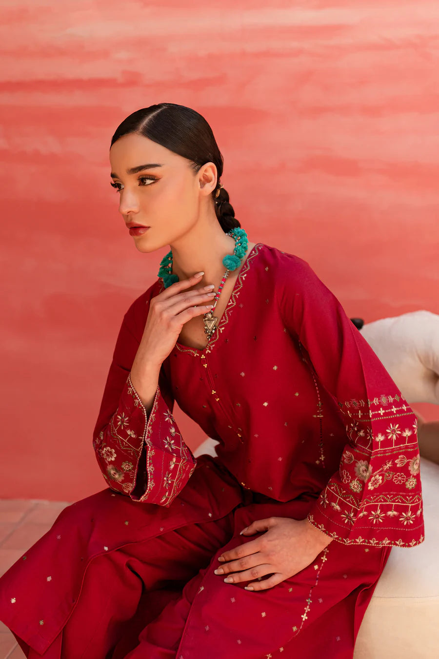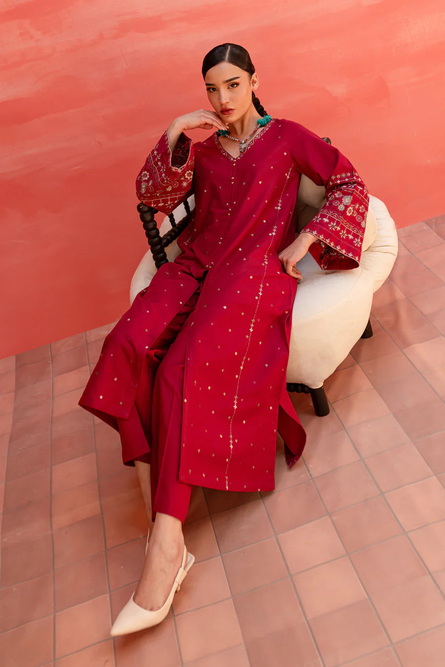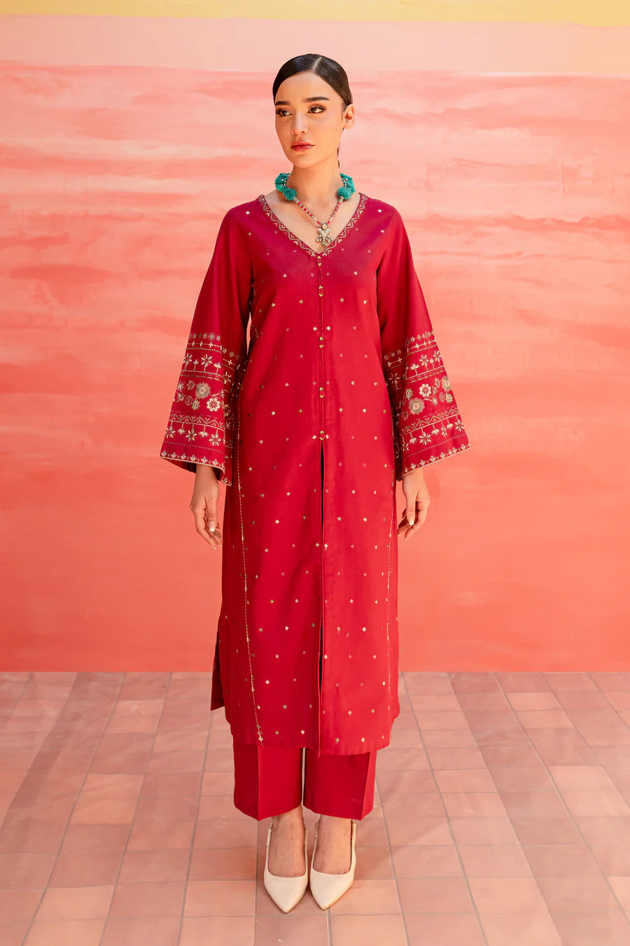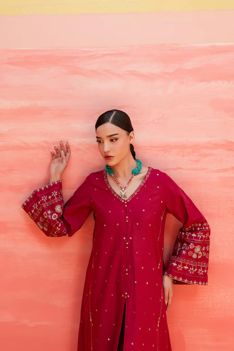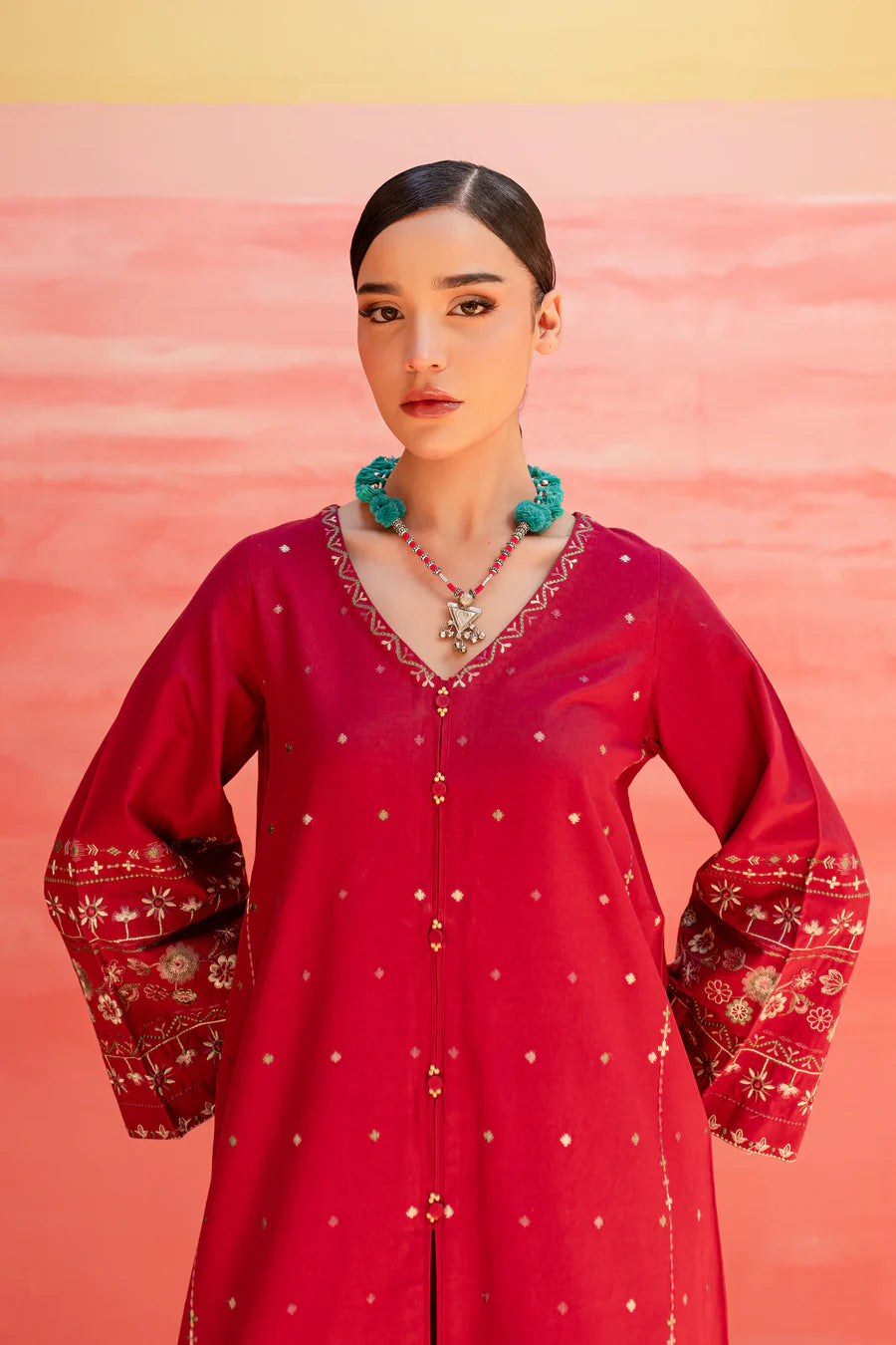 Effortlessly stylish, this embroidered Cotton 2-piece set combines modern design with subtle elegance. The Red front-open A-line shirt features minimal spread detailing and contemporary repeat embroidery on the sleeves, adding a touch of sophistication and craftsmanship.