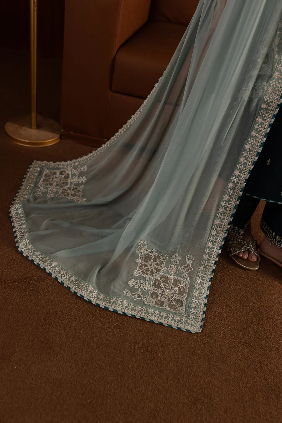 Drape the ensemble with a crinkle dupatta featuring embroidered patches at four corners and embroidered borders, finished finely with printed facings.