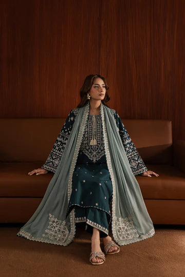 This classic outfit crafted from the most comfortable Cotton fabric in ocean green color is a must-have for the upcoming winter season. Beautifully designed embroidered shirt features heavily embroidered sleeves and neckline, finished with a tassel. Printed facings are added at the hem and sleeves for a fine finish.
