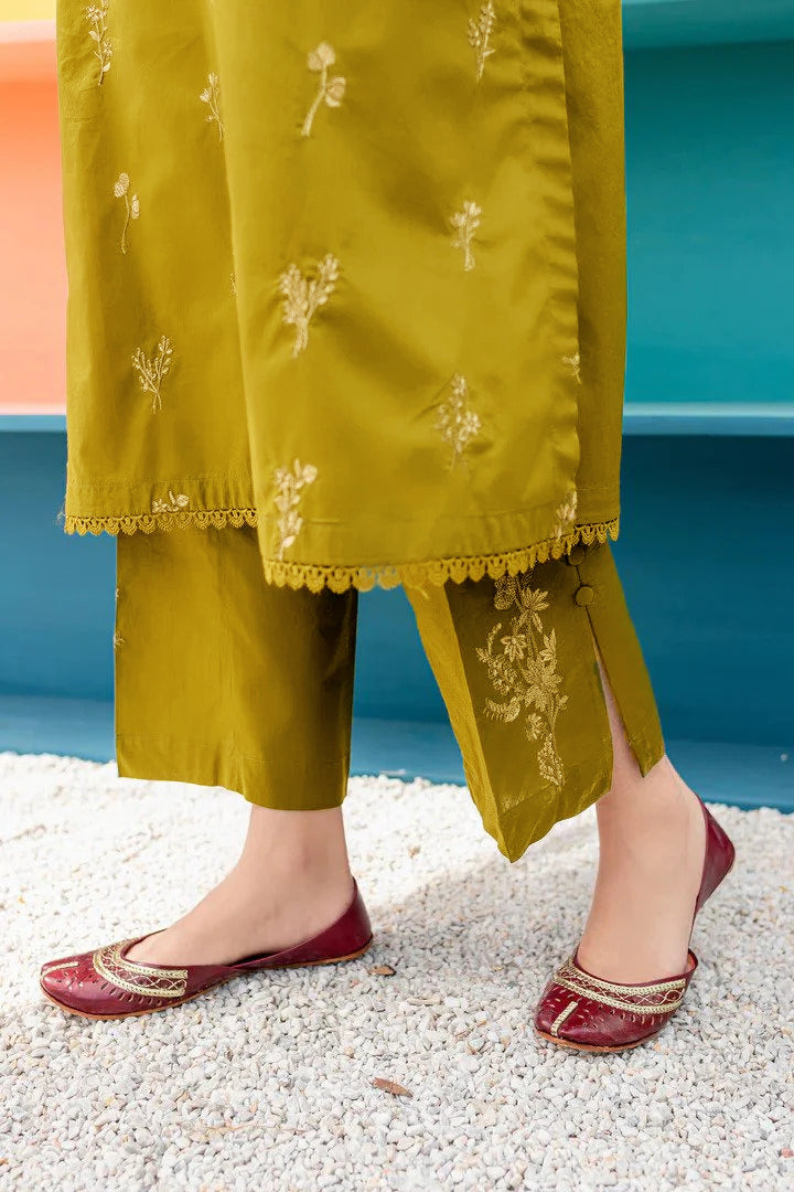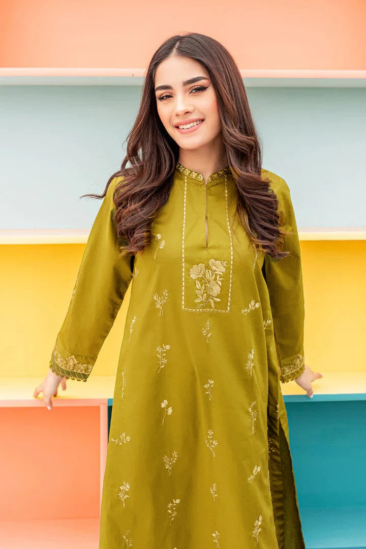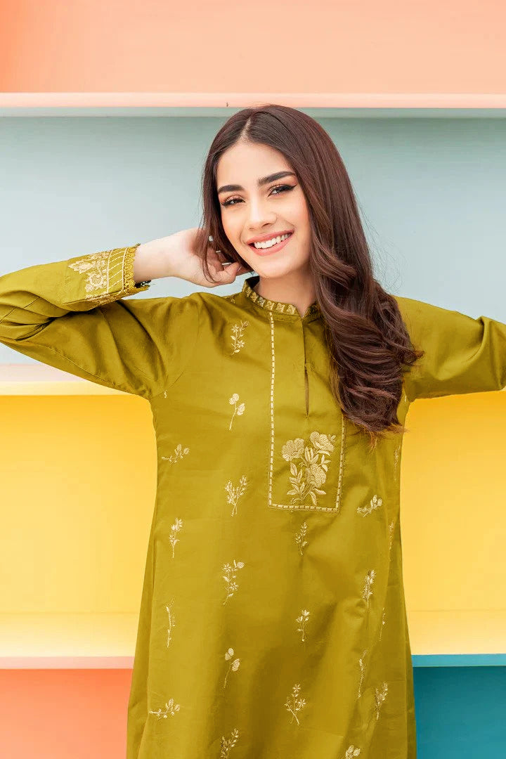 Gracefully crafted straight shirt cut from the high quality cotton the shades of mehndi green. Embellishments feature delicately embroidered ban neckline and spread motifs all over the front, straight sleeves finished with embroidered motif and border at cuffs with added crochet lace detailing